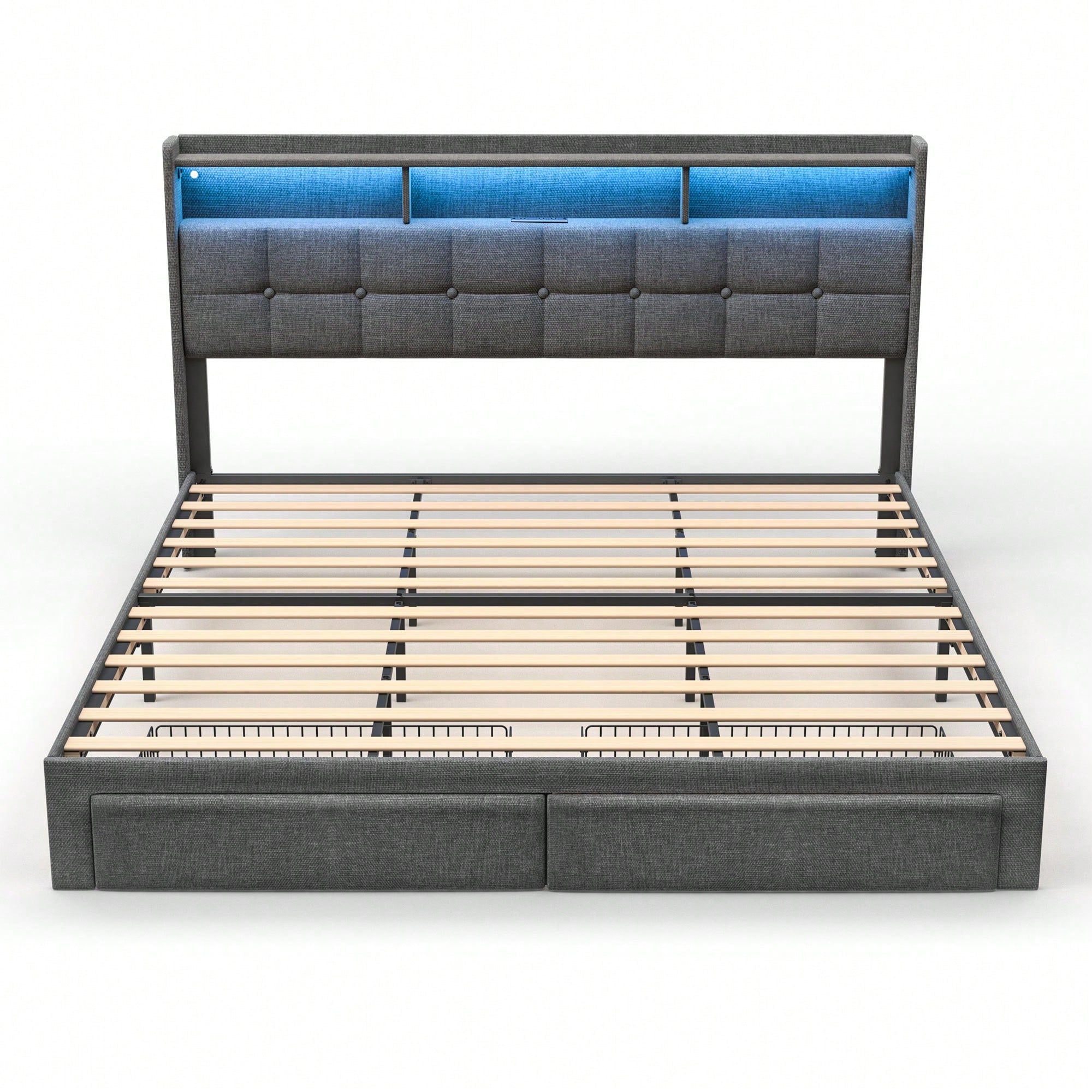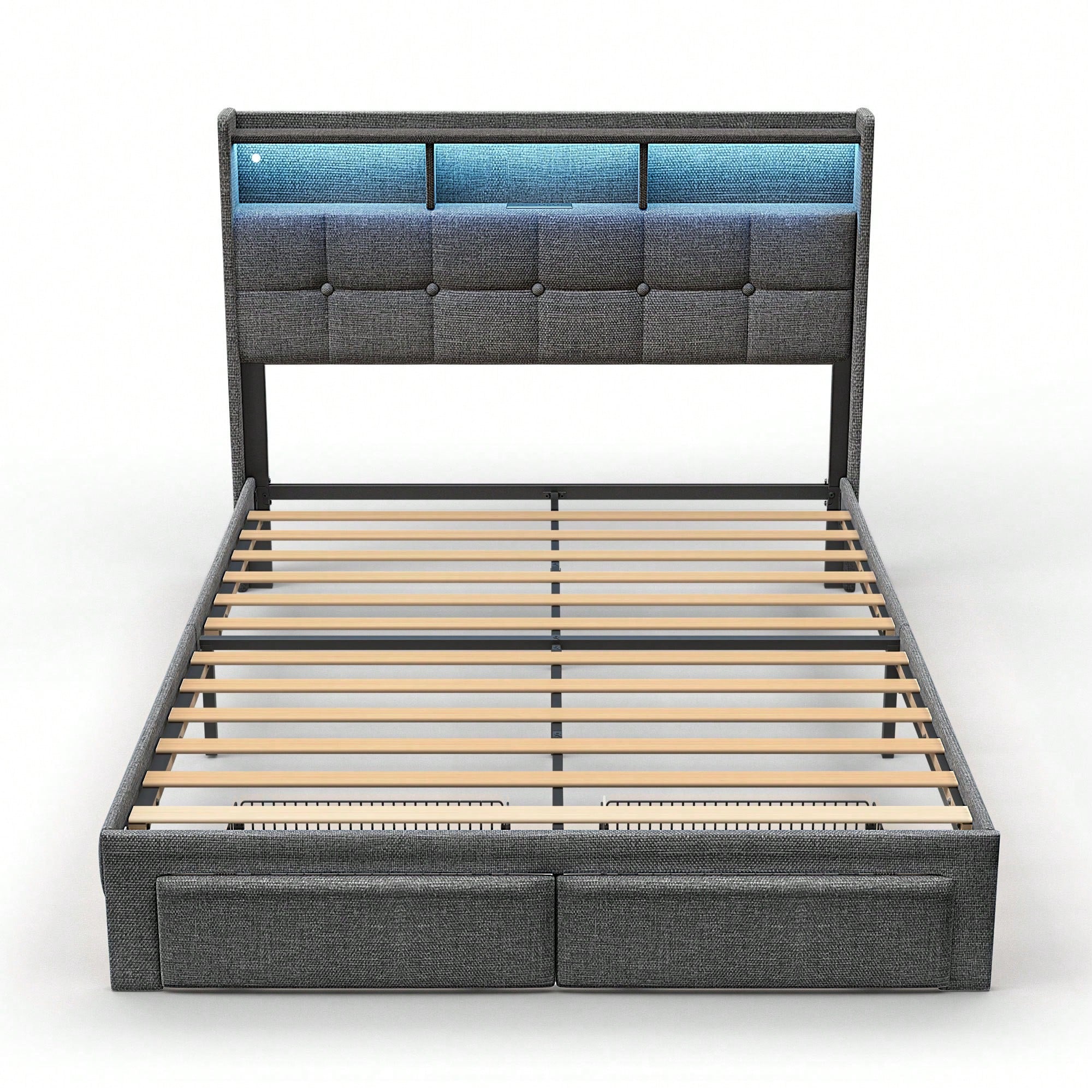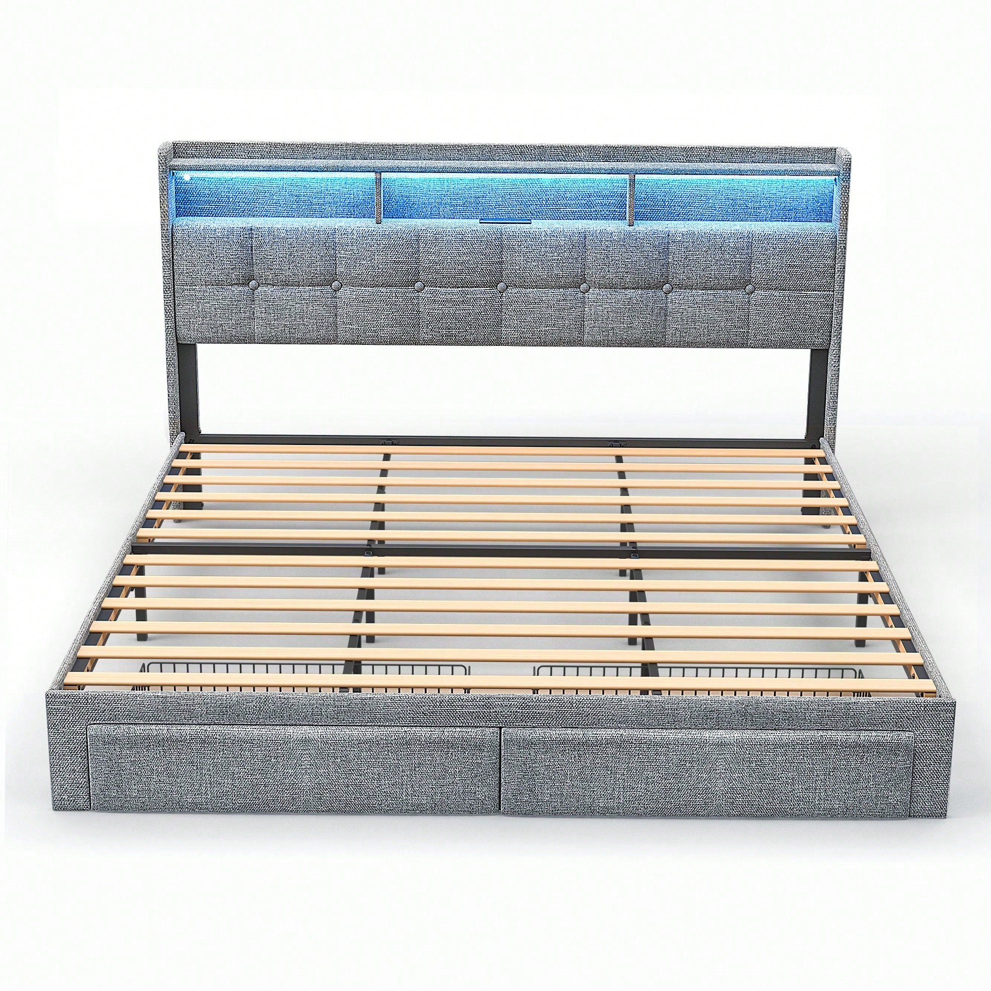 Queen Size Bed Frame with Storage Headboard Charging Station and Drawers Easy Assembly No Box Spring Needed