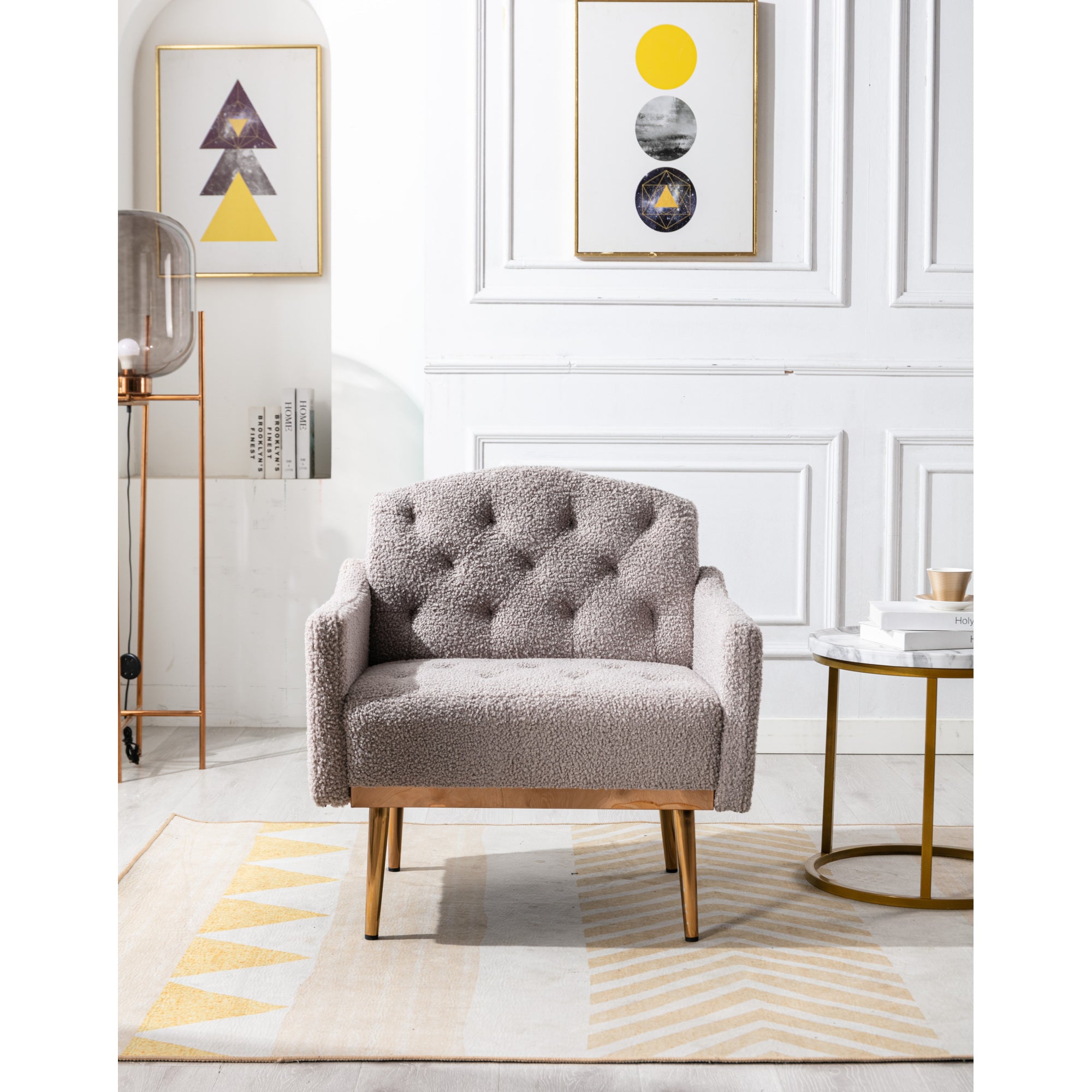 Modern Accent Chair with Arms, Tufted Decorative Fabric Upholstered Armchair with Gold Metal Legs, Stylish Reading Chair (Grey Teddy)