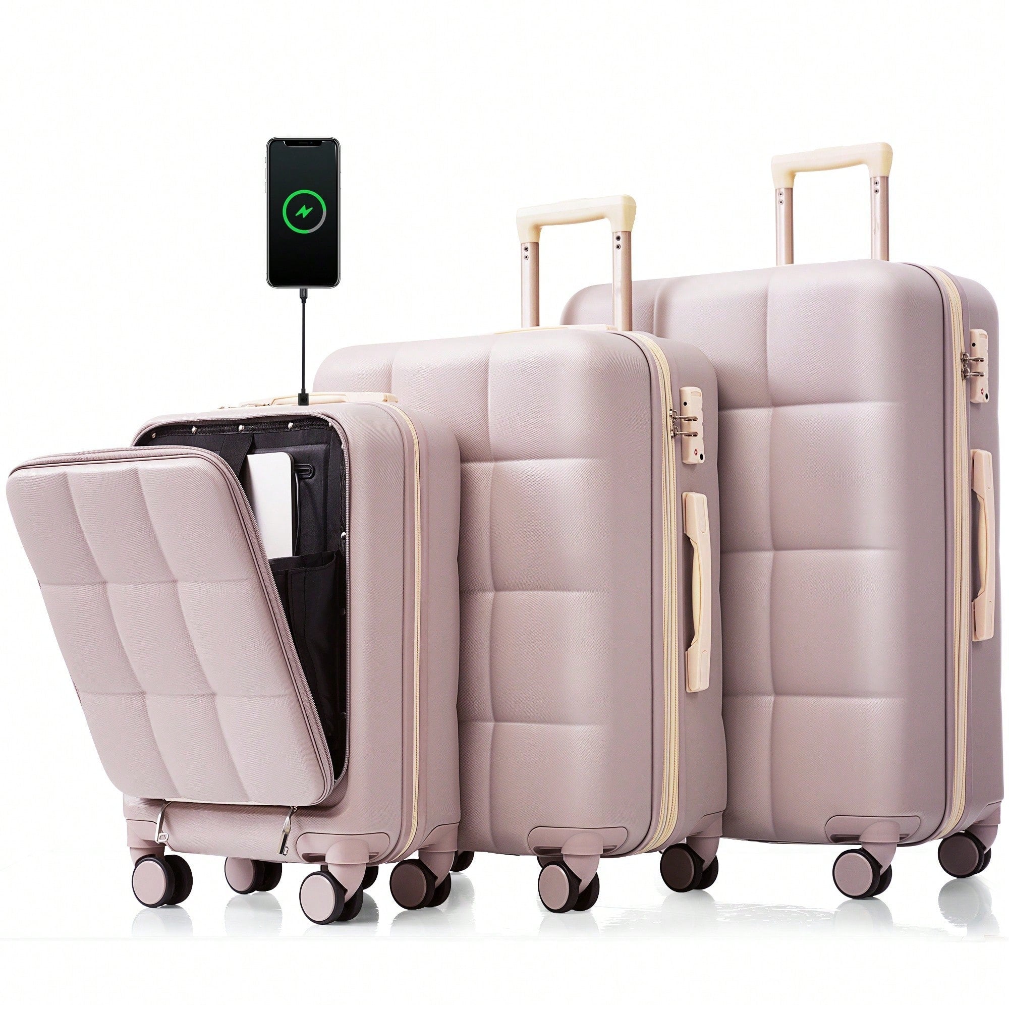 3 Piece Luggage Set 20 Inch With USB Port And Front Opening Design ABS Hard Shell With Spinner Wheels And Cup Holder In Pink