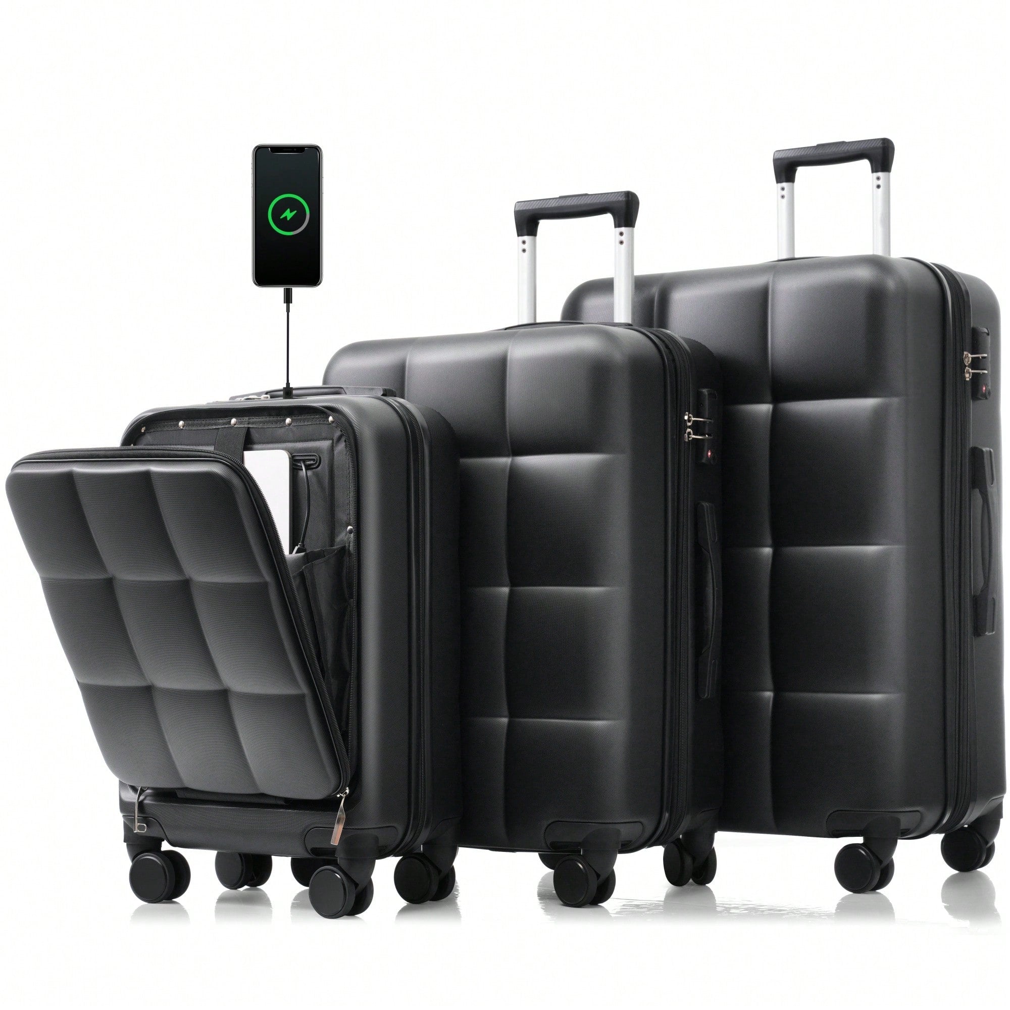 3 Piece Hard Shell Luggage Set With Front Pocket, 20 24 Inch Carry-On Bags, TSA Lock, USB Port, Universal Wheels, Gradient Blue Design