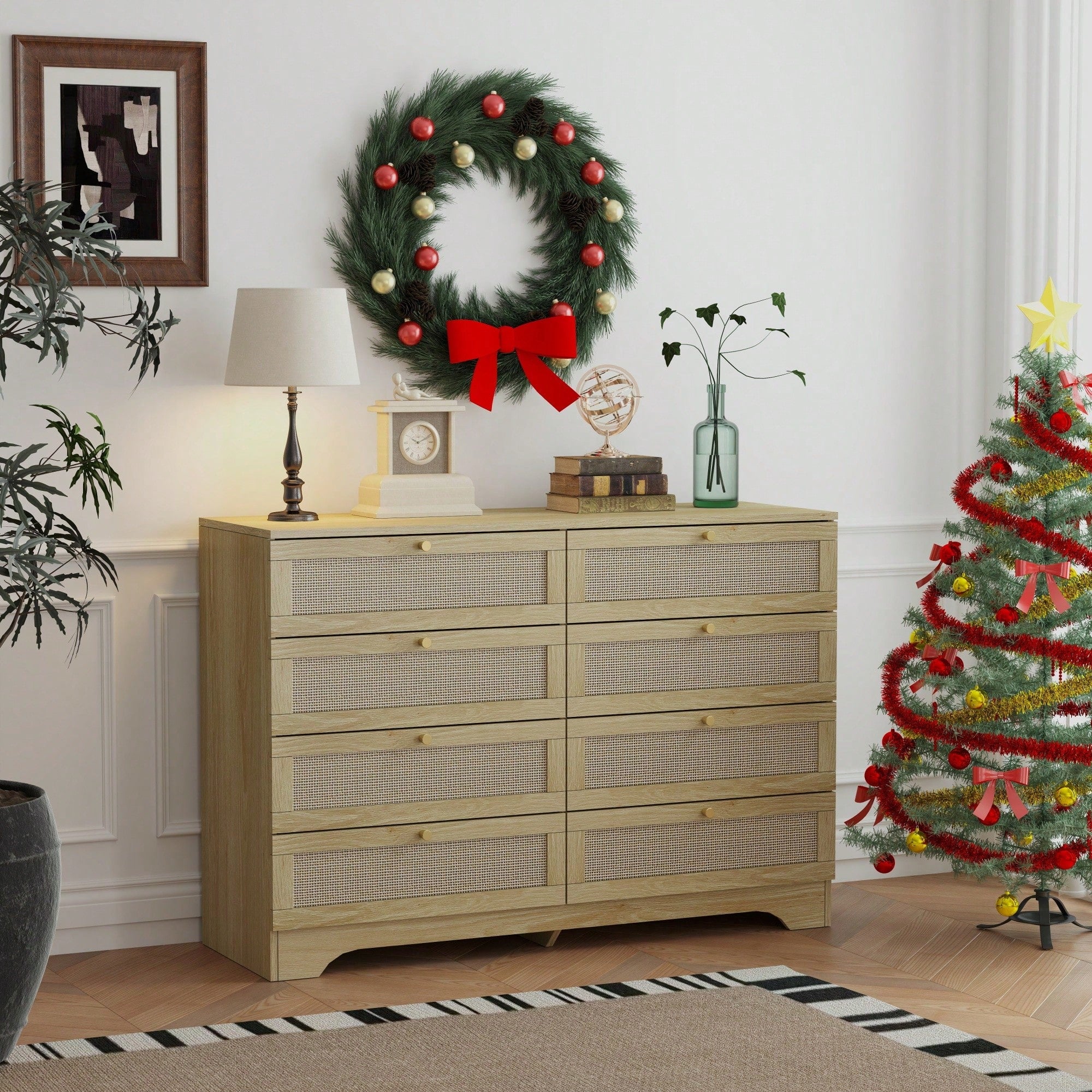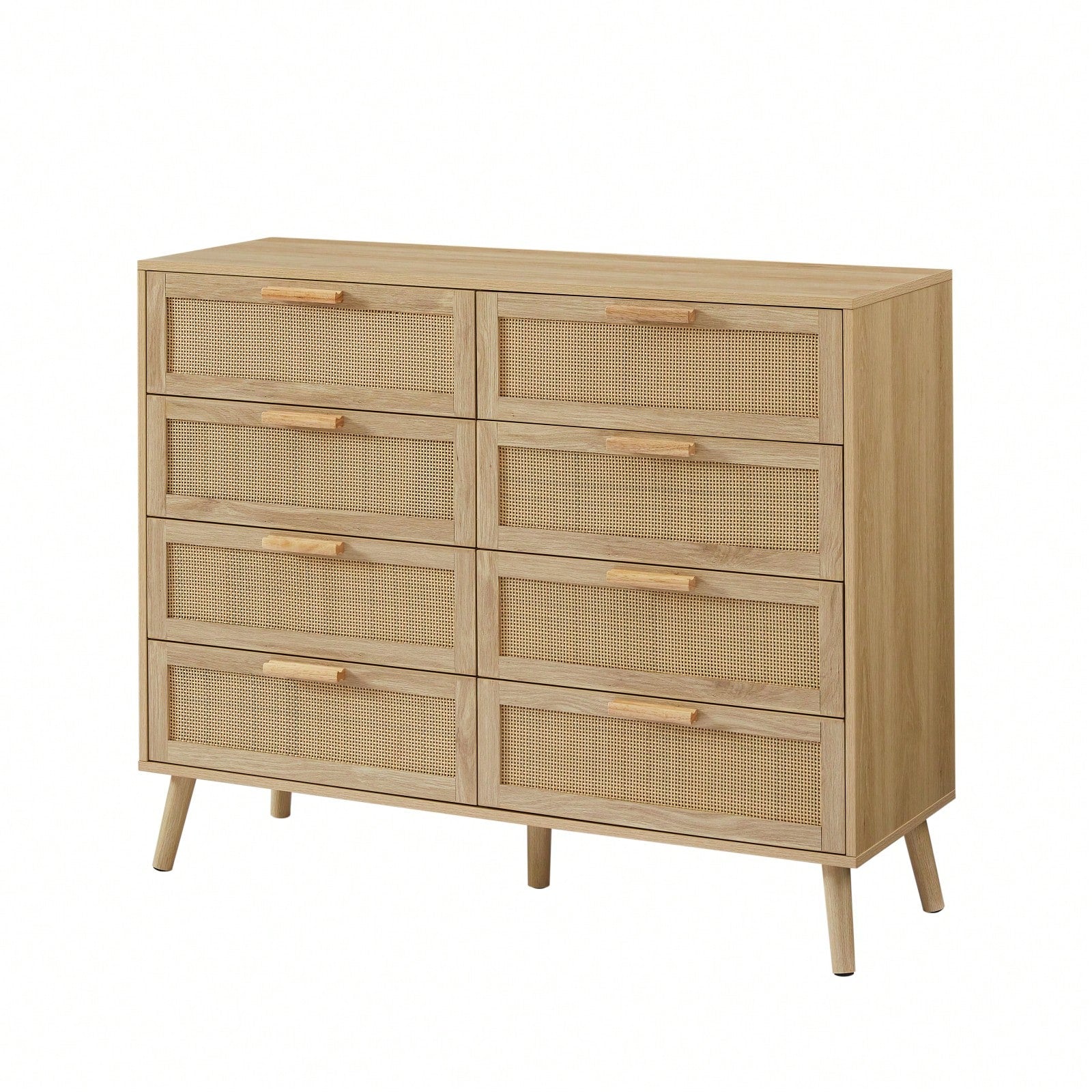 Natural Rattan 8 Drawer Double Dresser Boho Style Wooden Chest With Golden Handles For Bedroom Closet Living Room