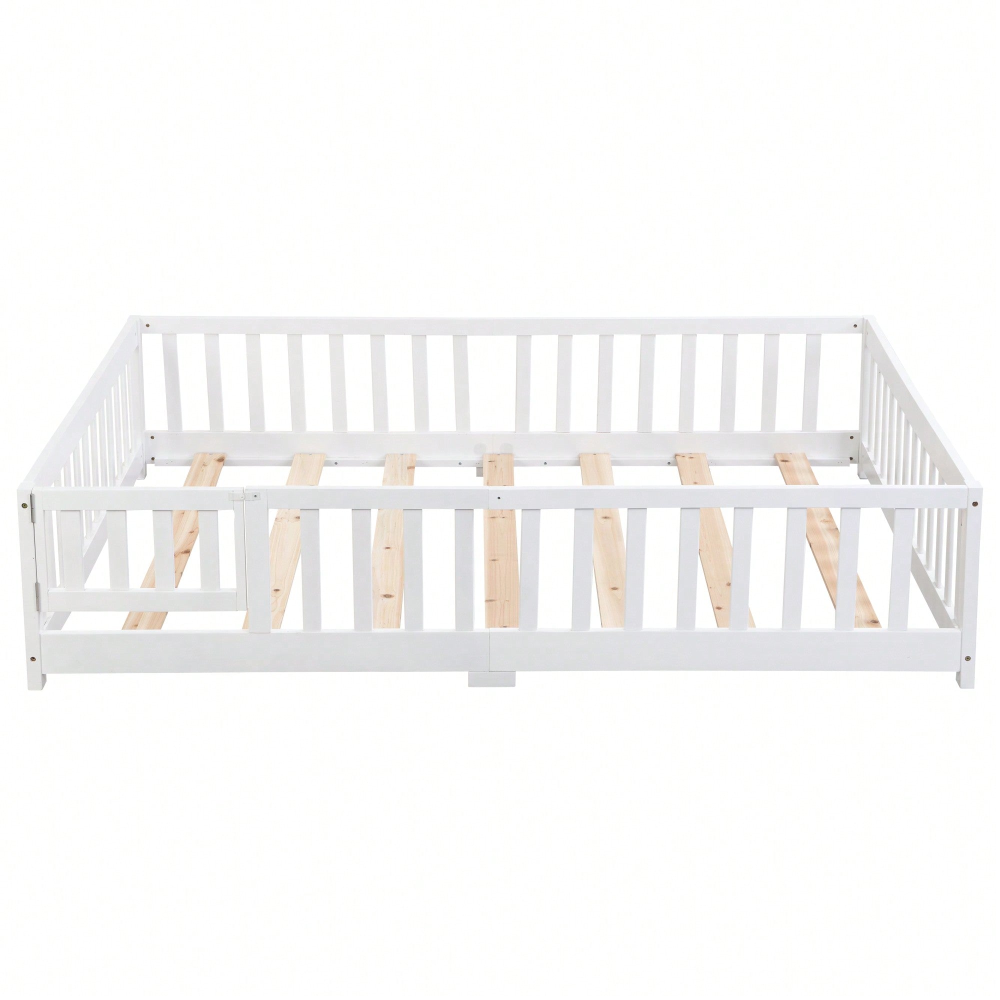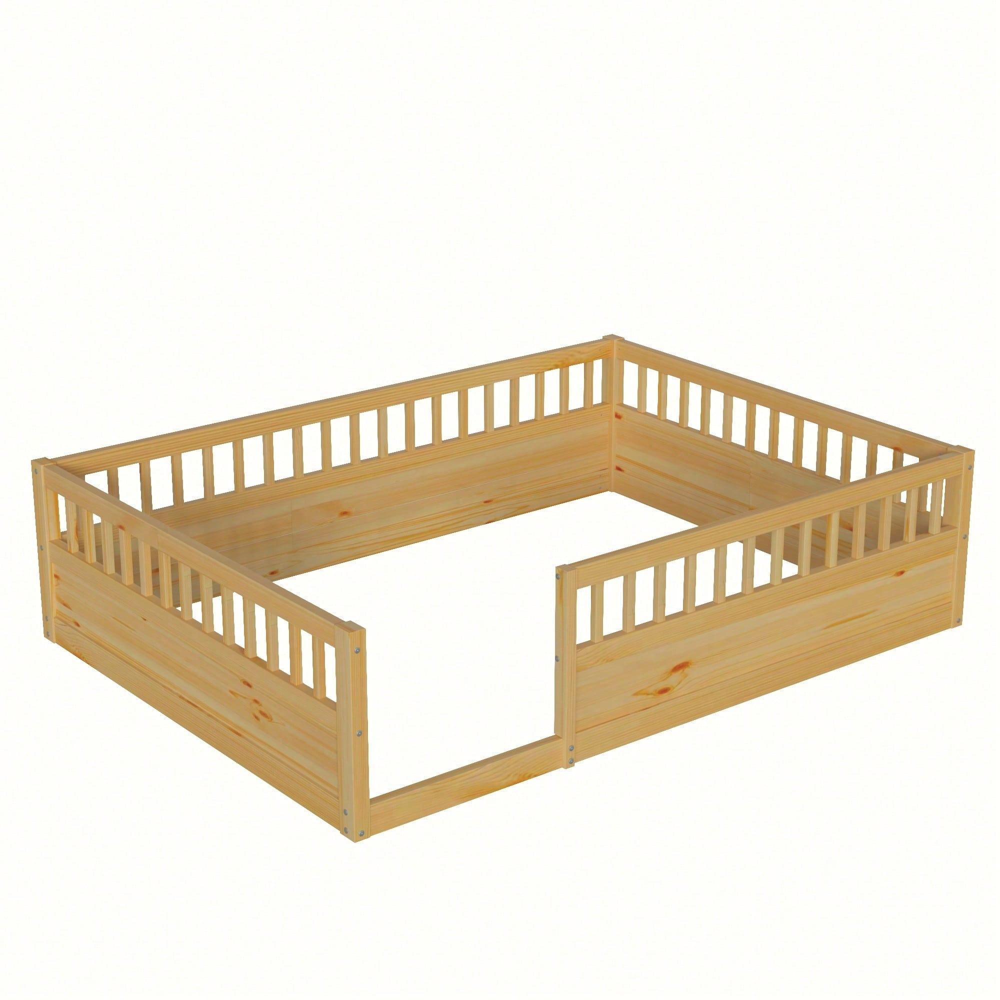 Natural Pine Wood Queen Size Floor Bed With Safety Fence Ideal For Kids