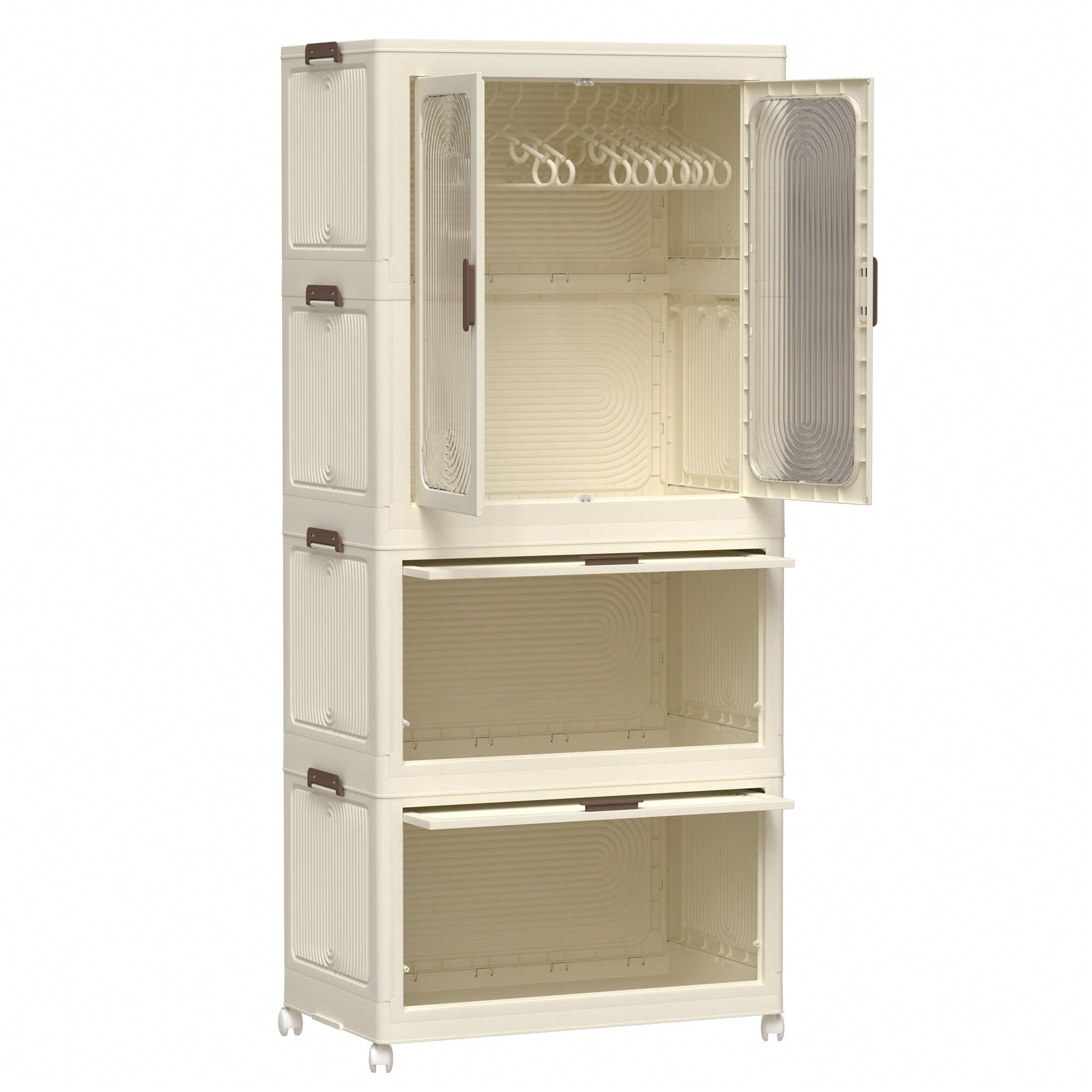 Portable Clothes Storage Organizer With Magnetic Doors, 4 Cubes, Hanging Rod, And 10 Hangers - Baby Wardrobe Cabinet In White