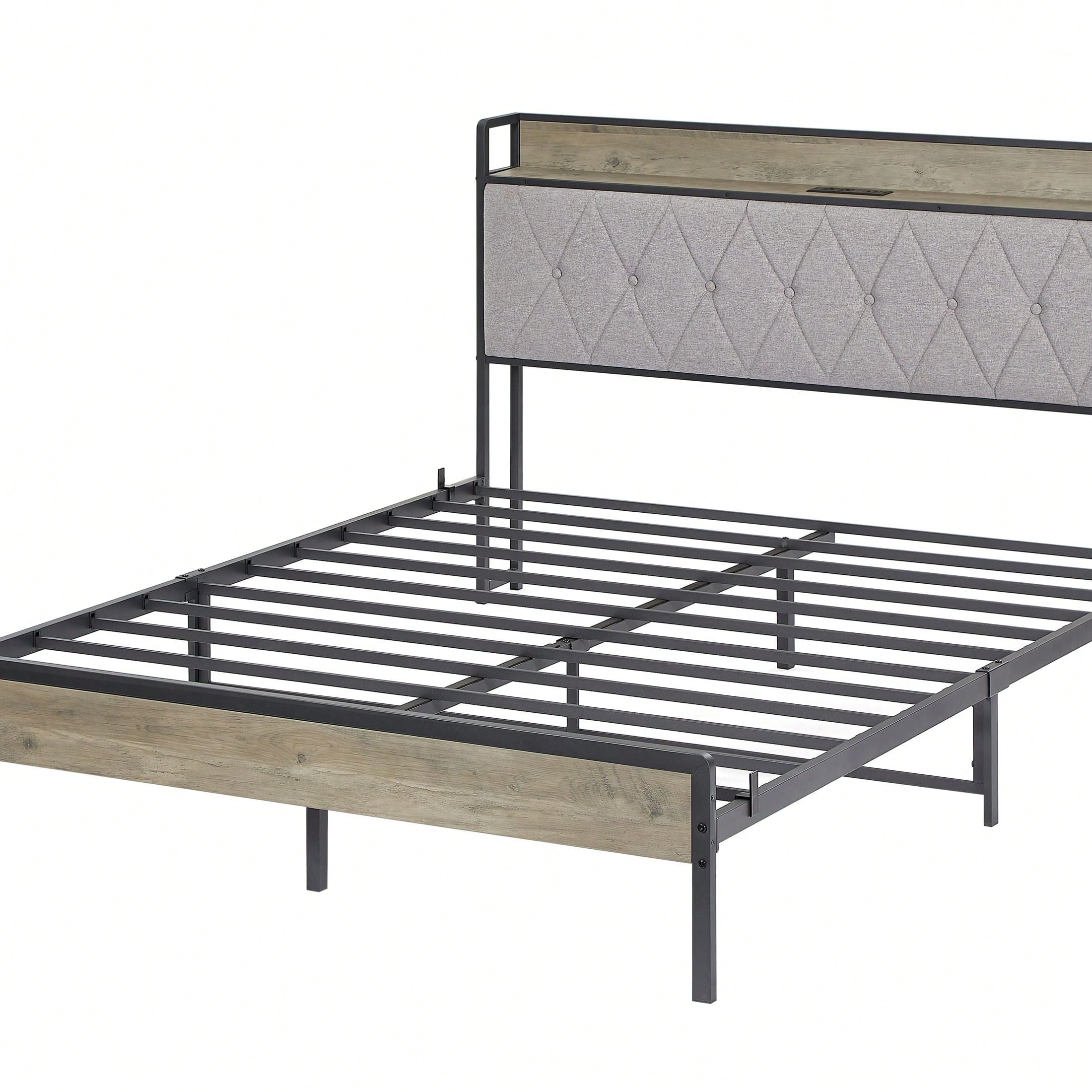 Queen Size Grey Bed Frame With Charging Station, Storage Headboard, And Sturdy Construction