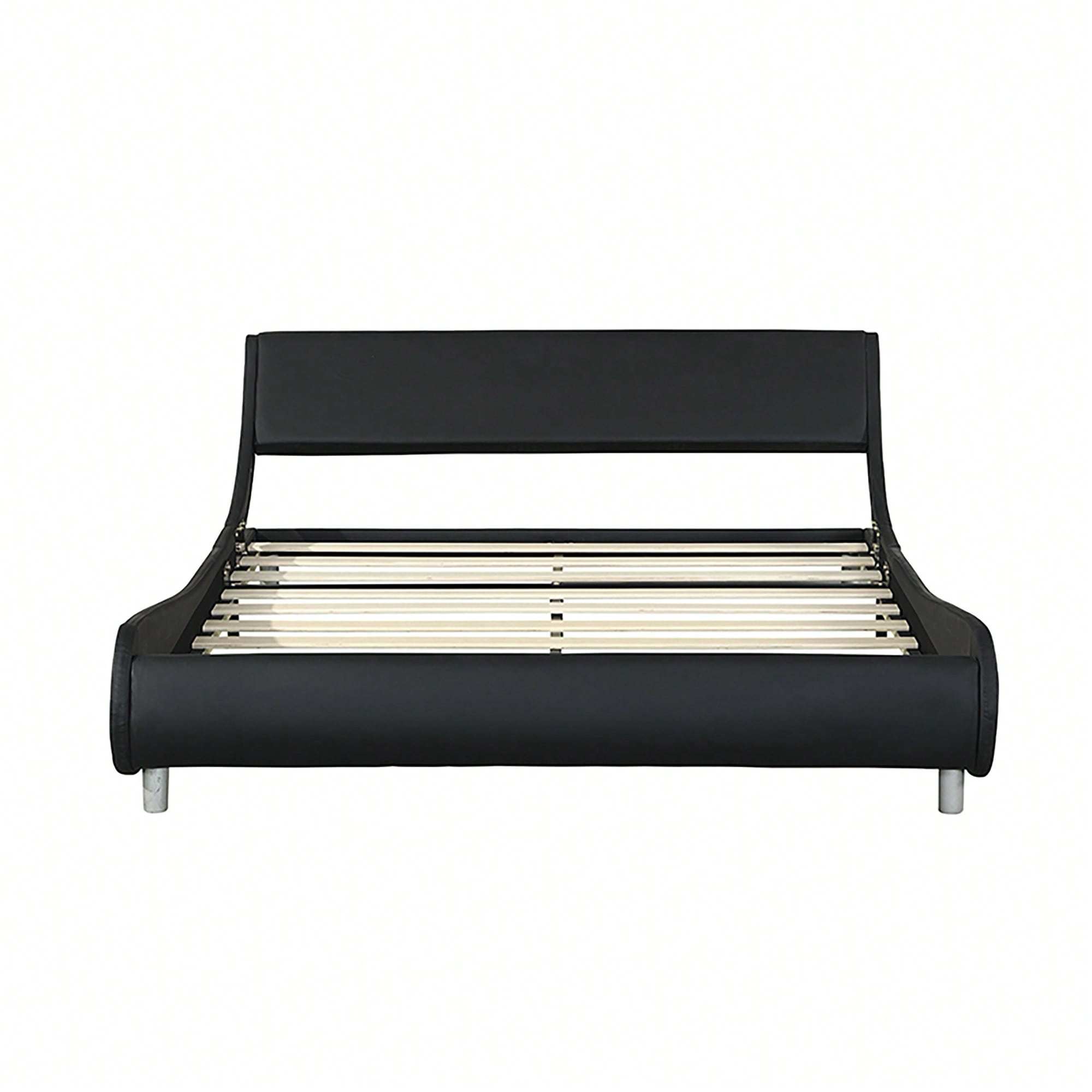 Queen Size Faux Leather Platform Bed Frame With LED Lighting Remote And App Control Curved Design Wood Slat Support Easy Assembly Black