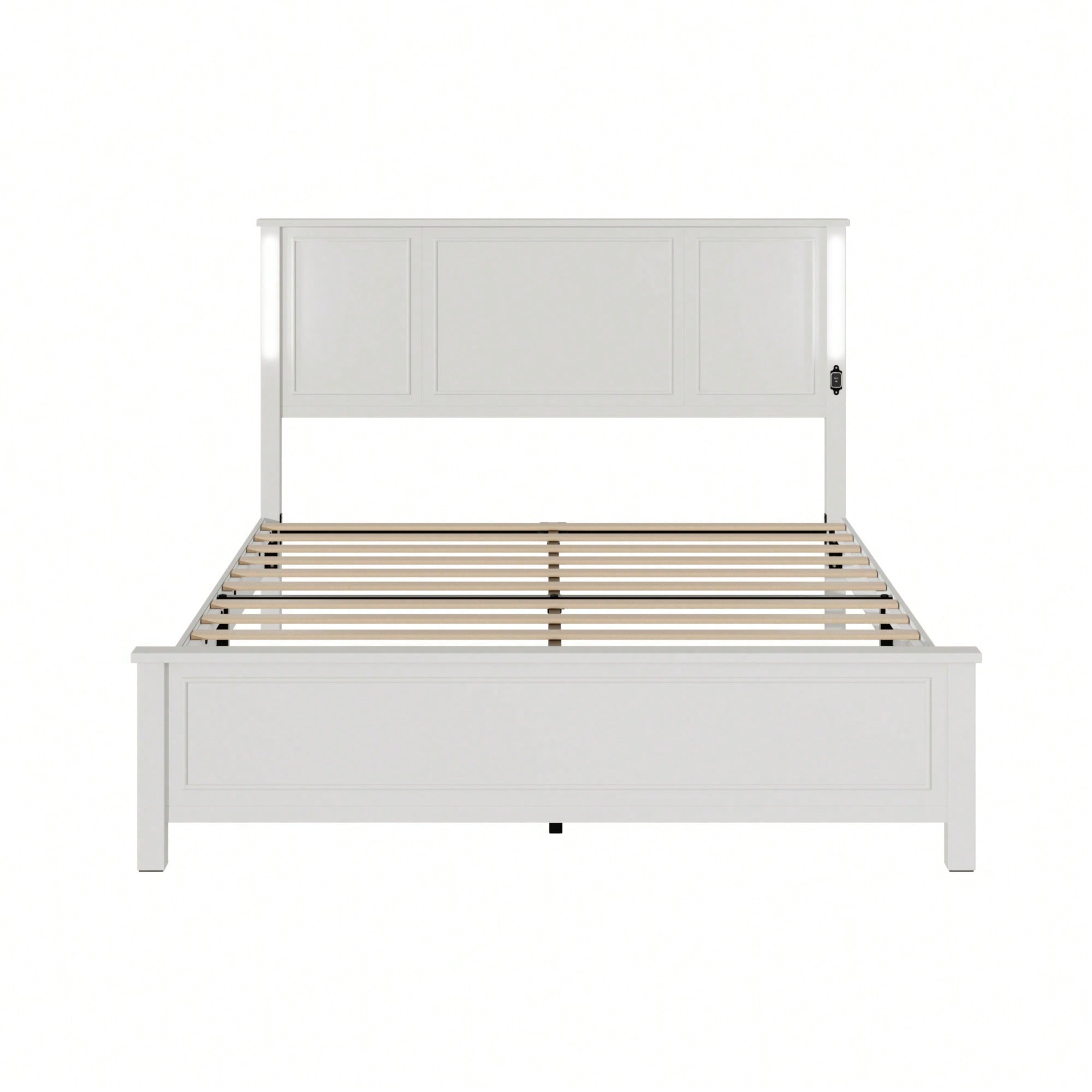 Queen Platform Bed Frame With Wood Headboard Footboard Charging Station LED Lights 12 Slats Support No Box Spring Needed Antique White