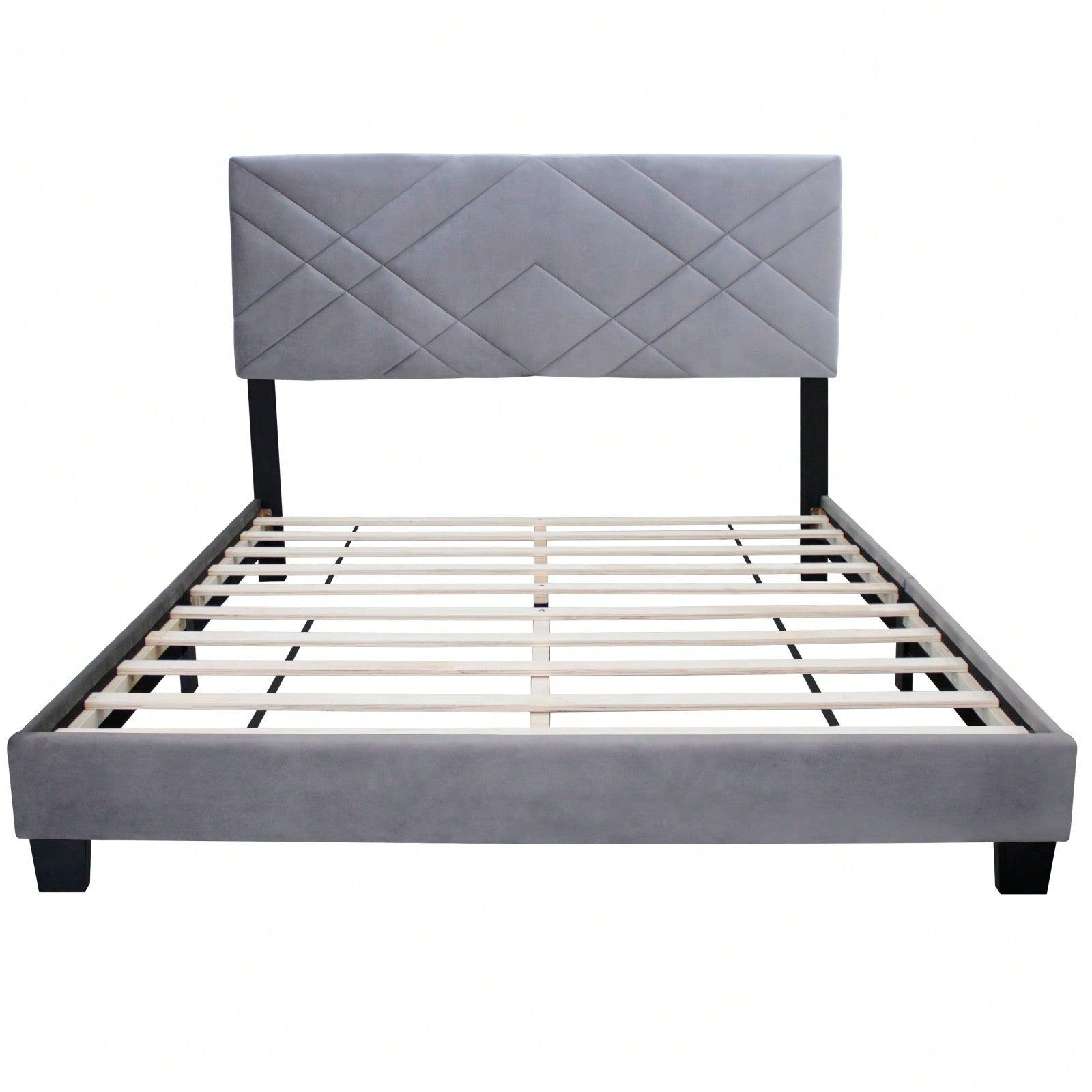 Queen Size Grey Upholstered Platform Bed Frame With Wooden Slats Support And Stylish Headboard