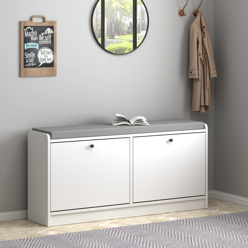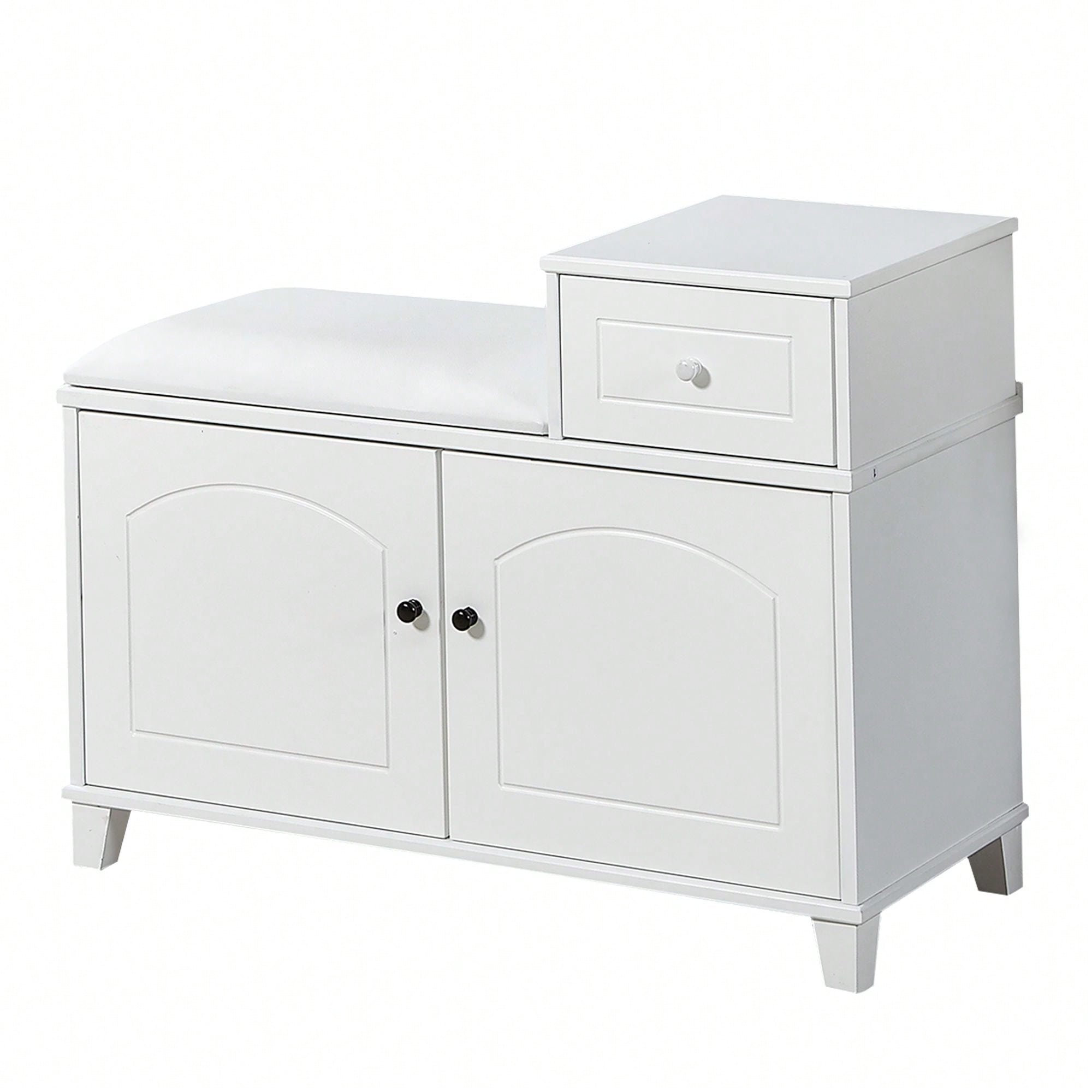Shoe Storage Bench Cabinet With Fireproof PU Cushion, Double Doors, And Movable Drawer White