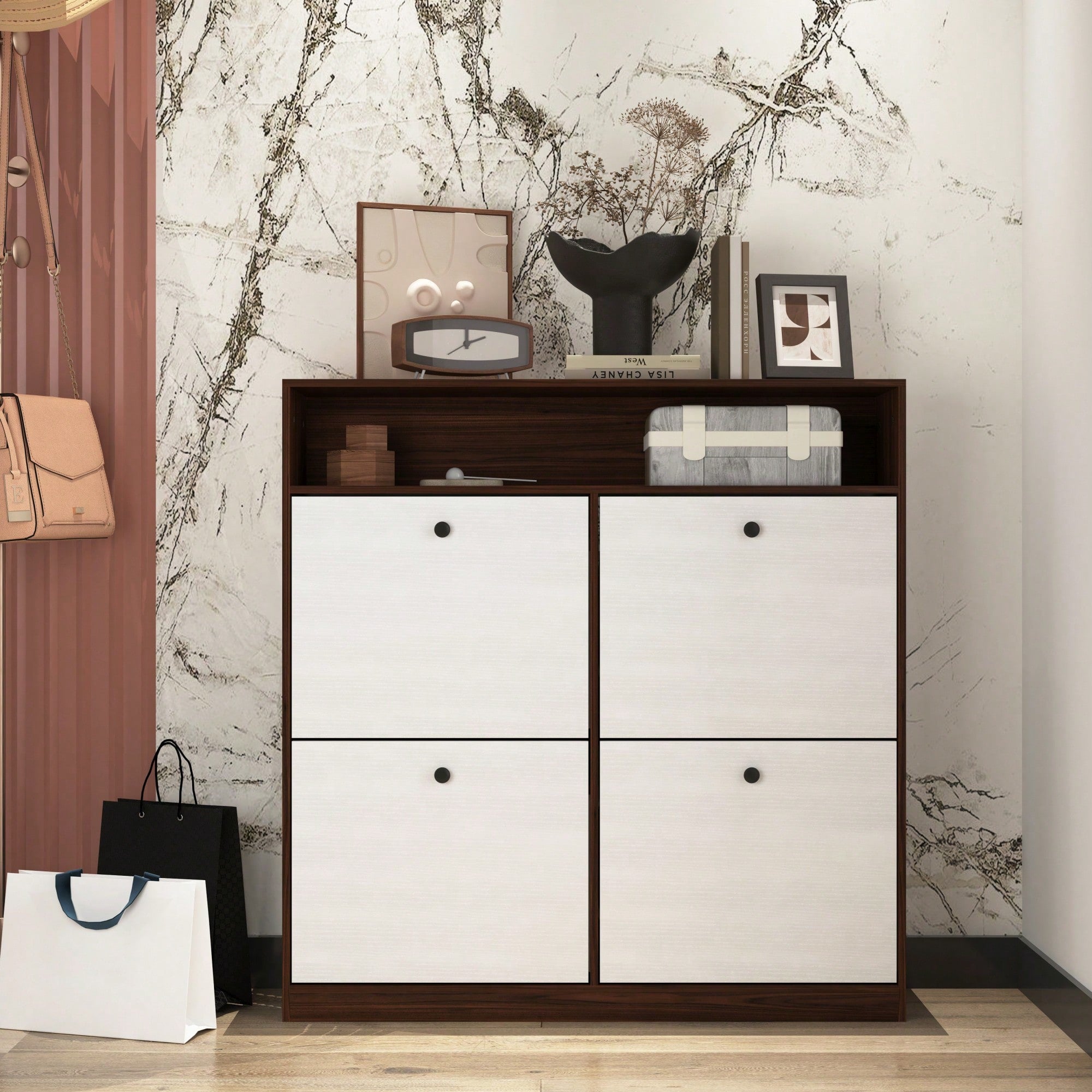 Shoe Storage Cabinet With 4 Flip Drawers Freestanding Organizer For Entryway And Hallway With Wooden Handle And Anti-Tip Fitting