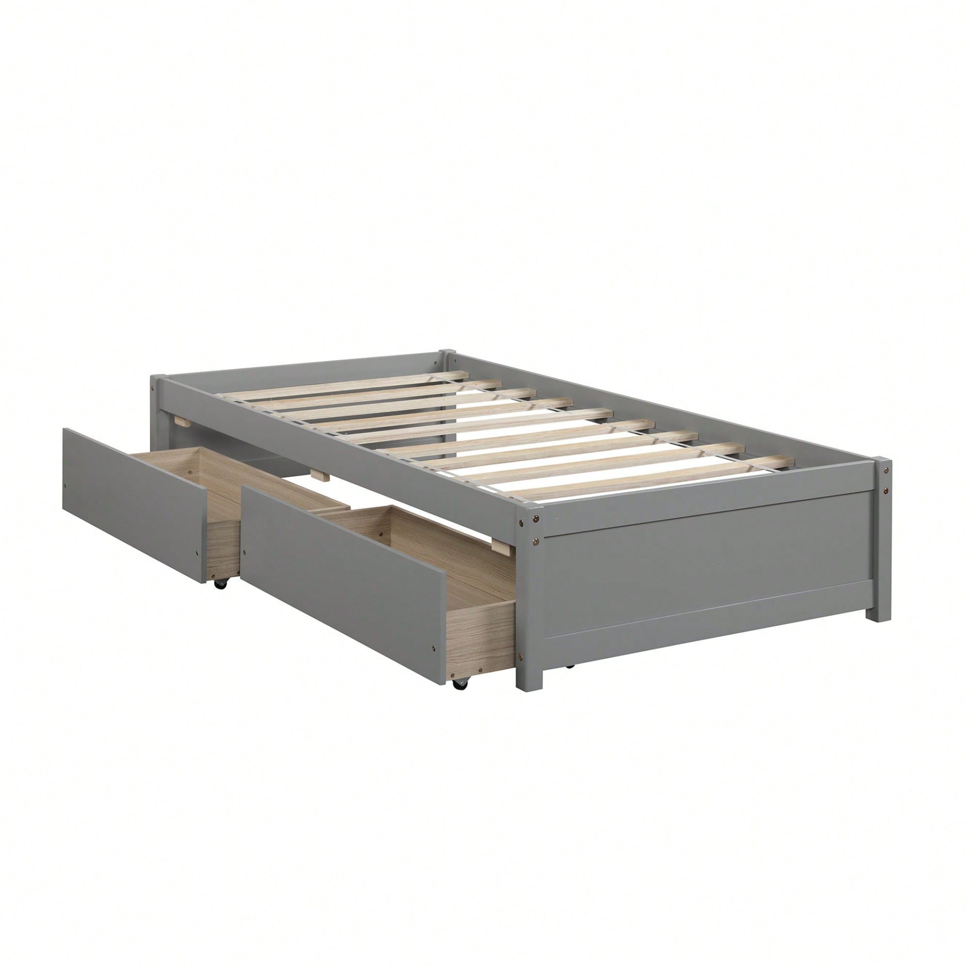Solid Wood Twin Bed With 2 Storage Drawers, No Box Spring Required, Grey Finish
