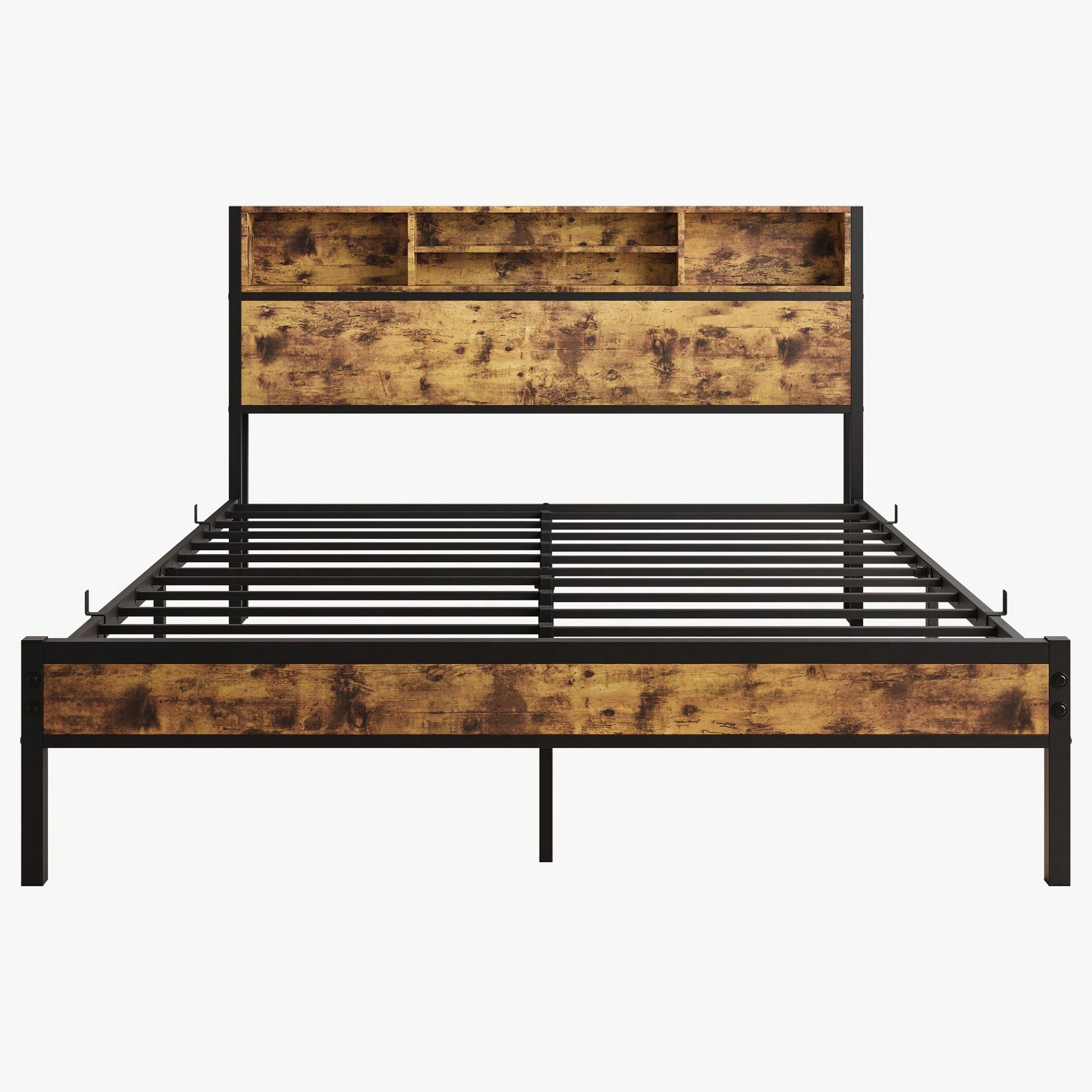 Sturdy Noise-Free Queen Bed Frame with Storage Headboard and Charging Station Easy Assembly Metal Platform No Box Spring Needed