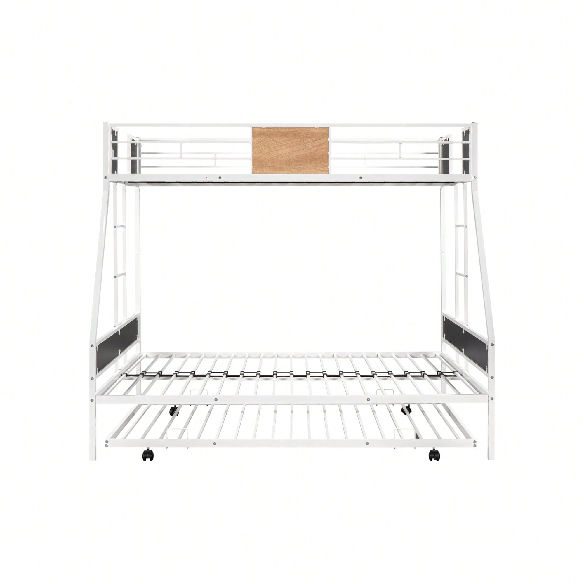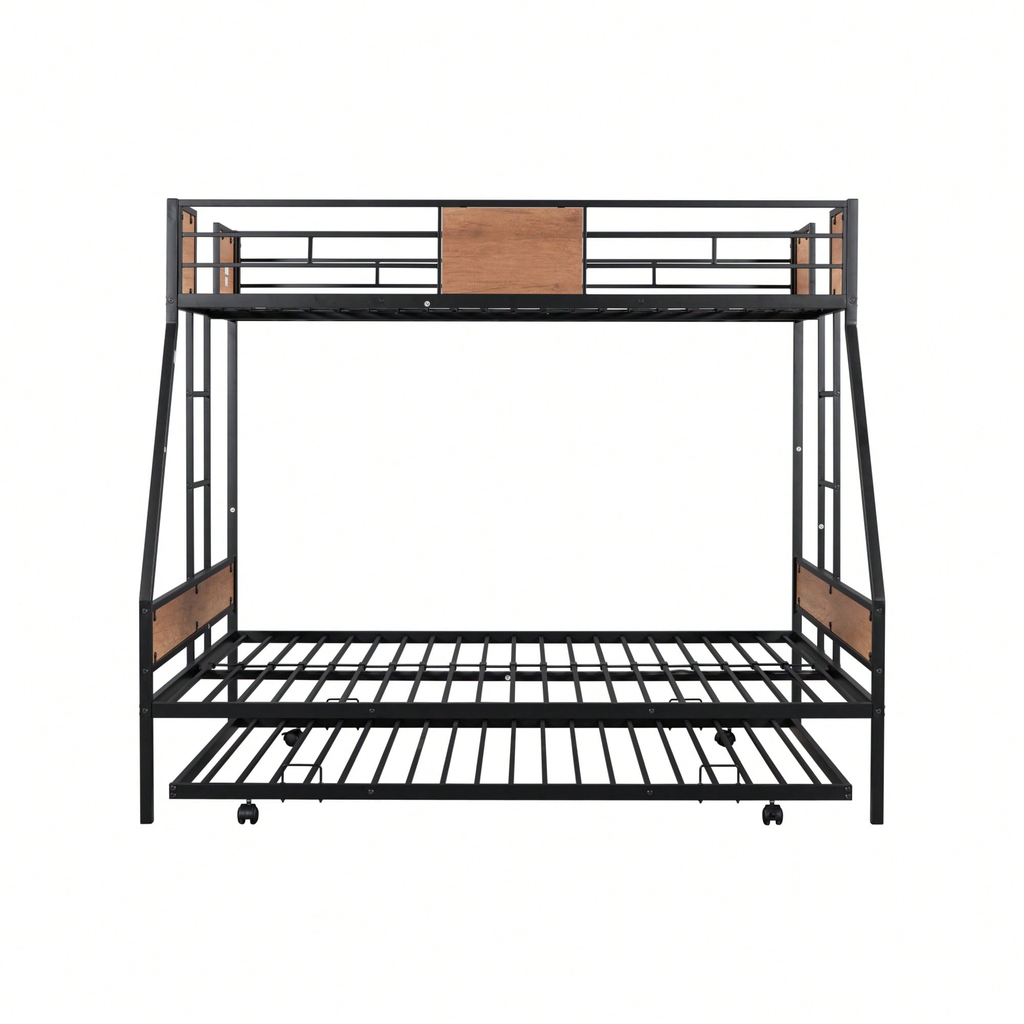 Sturdy Twin Over Full Bunk Bed with Trundle and Guardrail Space-Saving Design for Three with Wooden Accents