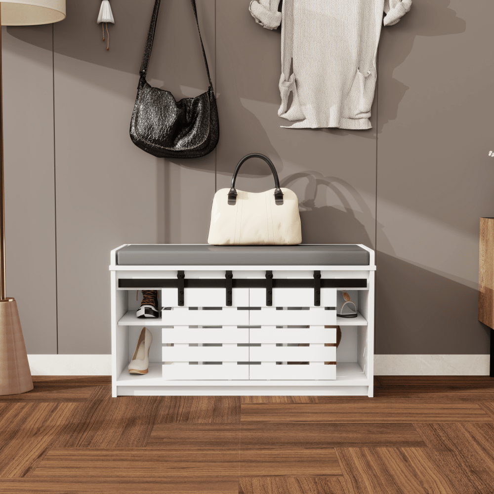 Stylish 2-Tier Shoe Storage Bench With Sliding Barn Doors And Removable Soft Cushion For Entryway Hallway Or Bedroom In White