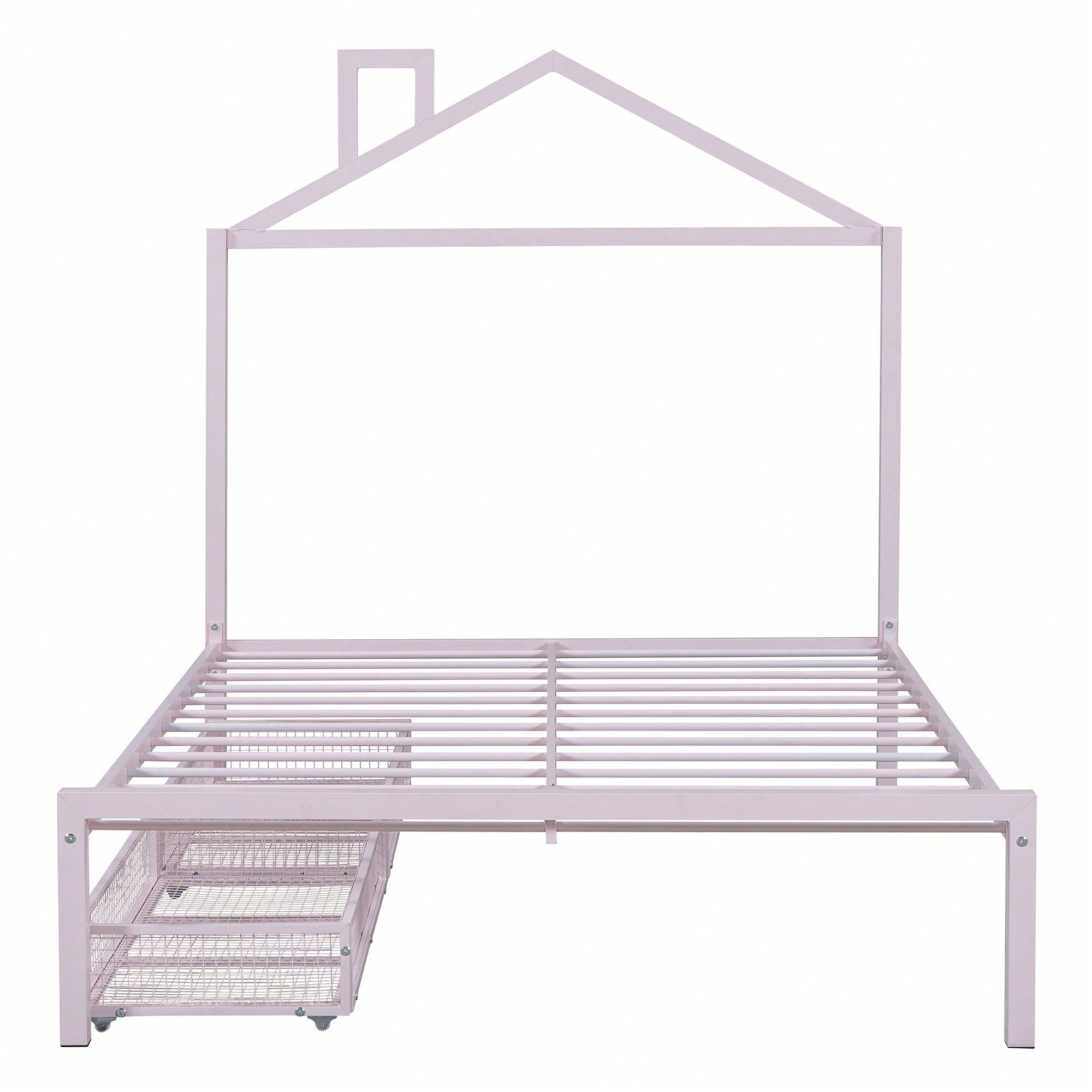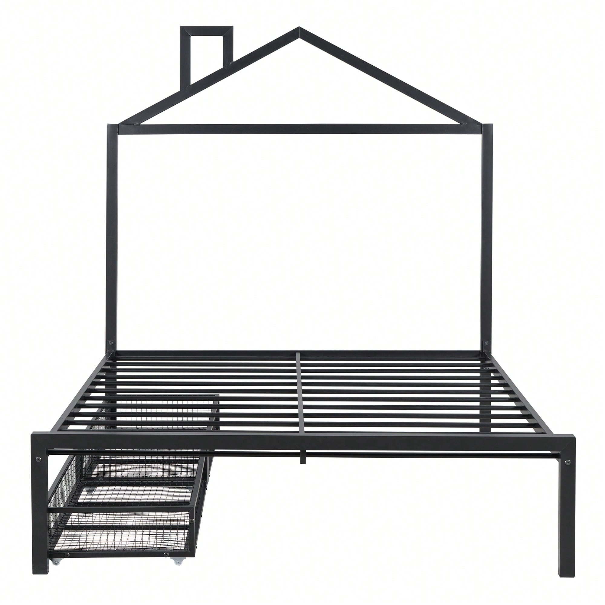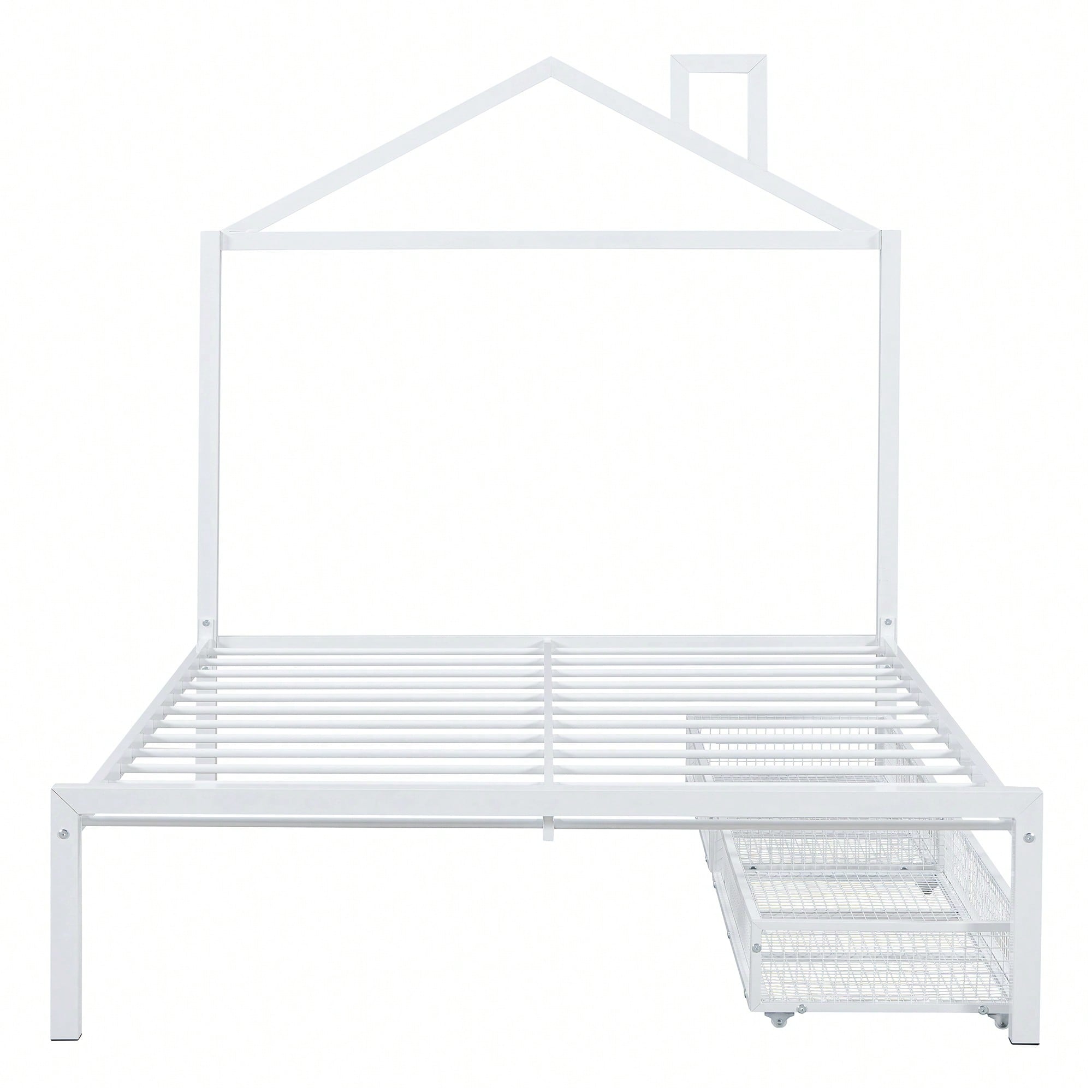 Stylish Full Size Metal Platform Bed With Storage Drawers And House-Shaped Headboard In White