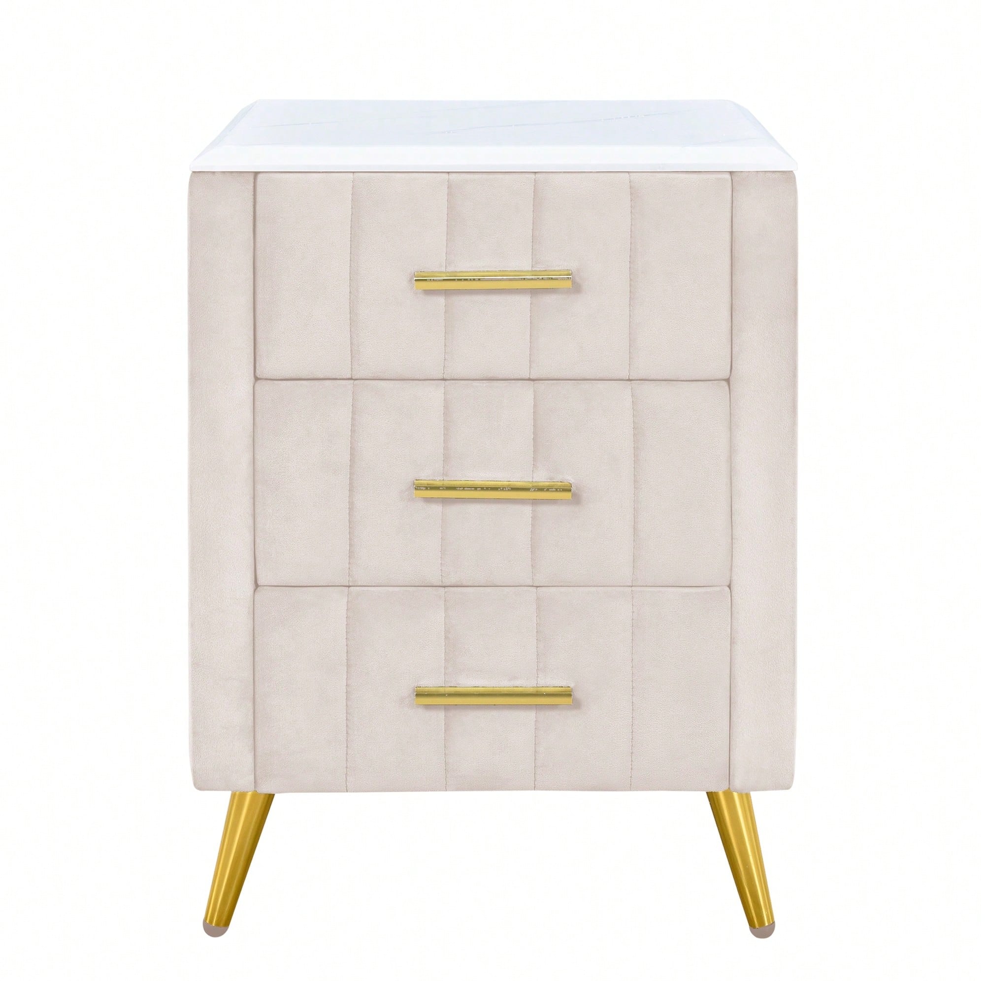 Stylish Pink Upholstered Nightstand With 3 Drawers And Metal Legs, Elegant Bedside Table Featuring Marbled Top