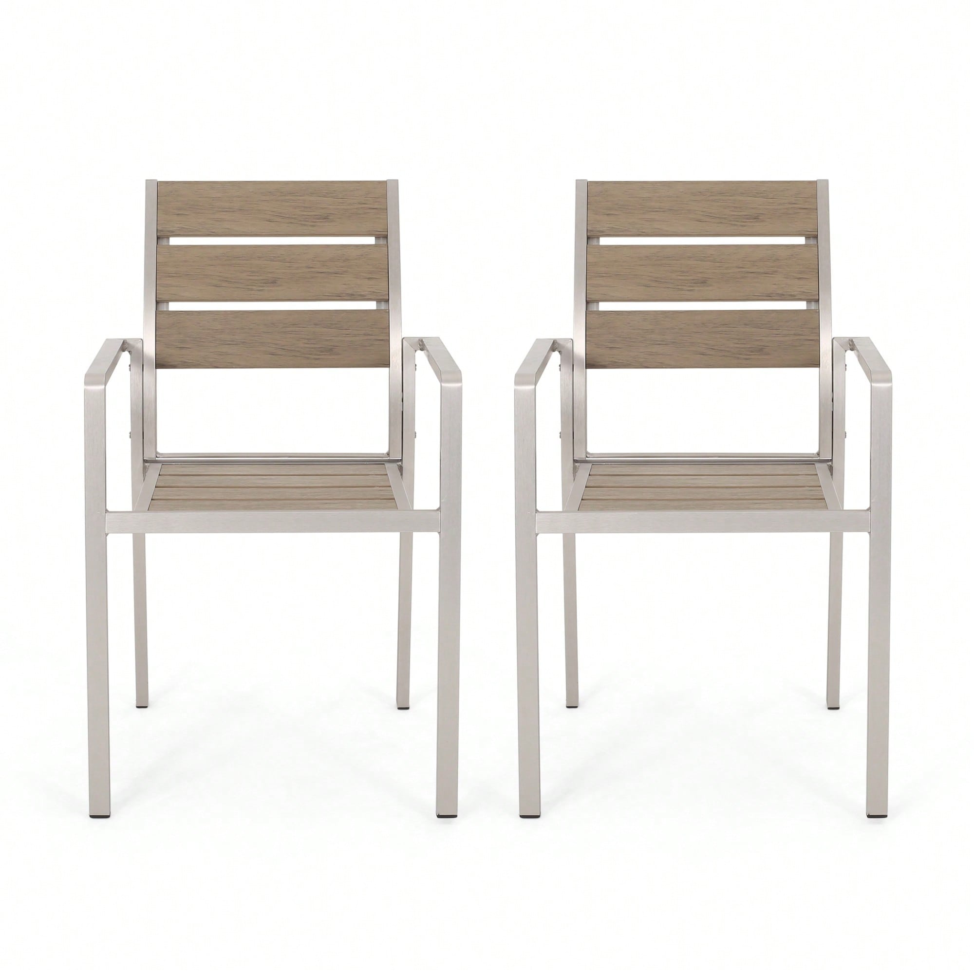 Stylish Outdoor Aluminum Dining Chairs With Faux Wood Seat Set Of 2 Natural Silver Finish