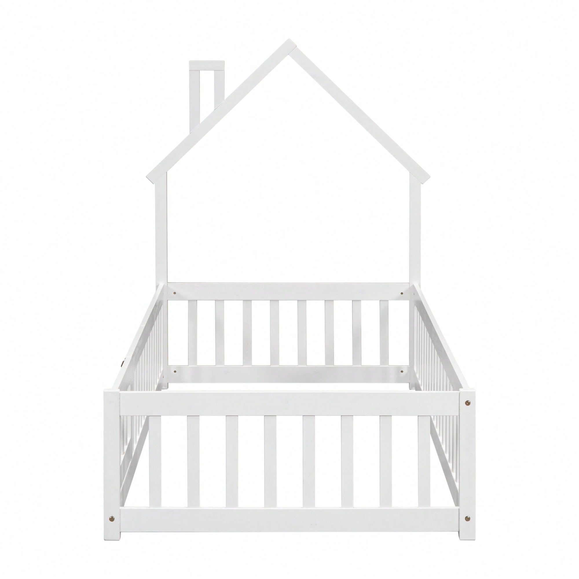 Twin House-Shaped Headboard Floor Bed With Safety Fence In White