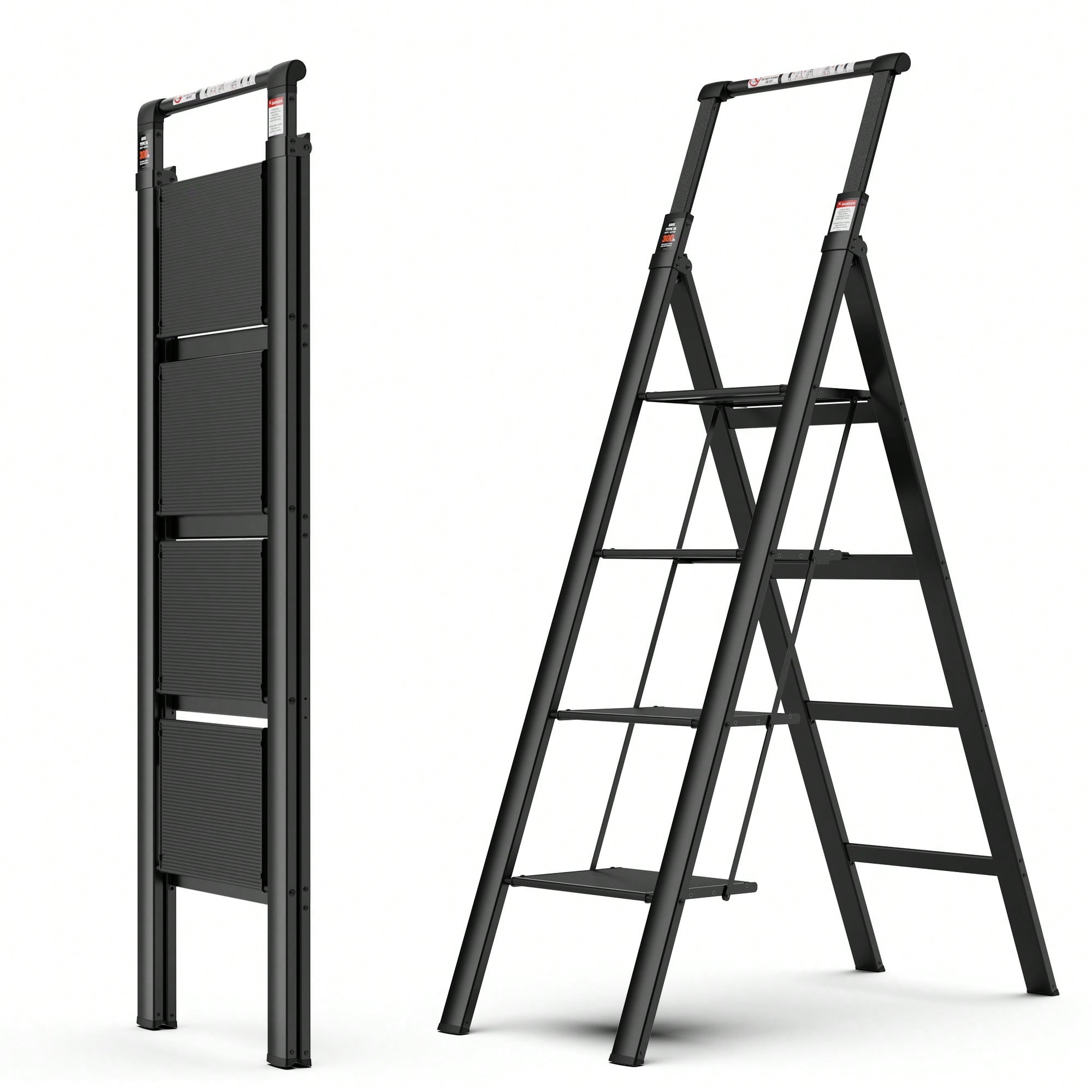 4-Step Folding Ladder With Retractable Handgrip And Anti-Slip Wide Pedal – Durable Aluminum Design, Supports 300lbs For Safe Household Use