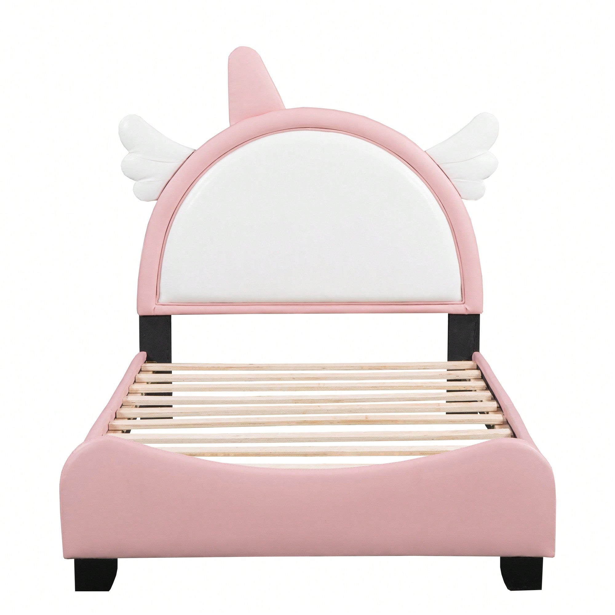 Adorable Twin Size Upholstered Bed With Unicorn Headboard And Footboard In White And Pink