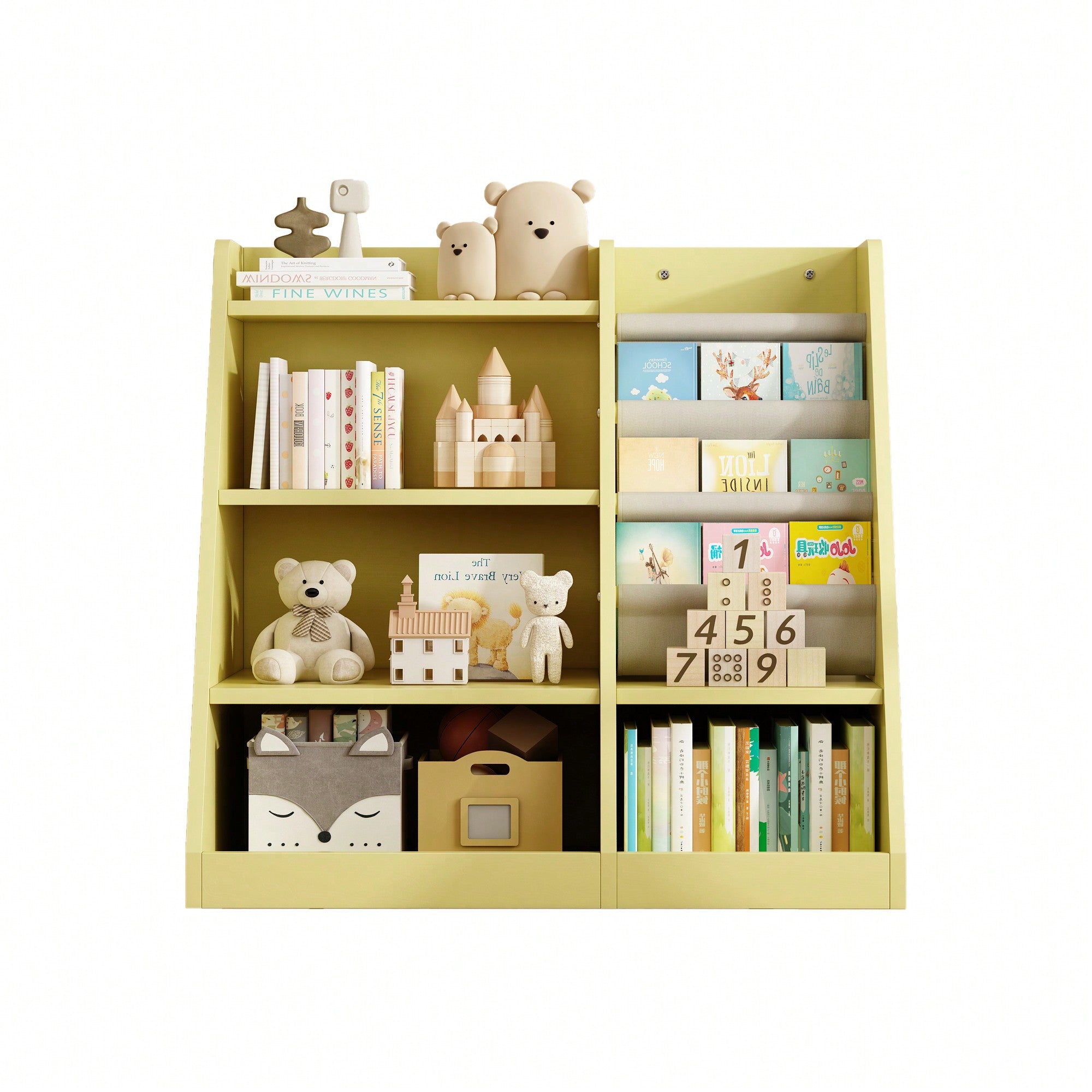 Adjustable Yellow Wooden Toy Storage Organizer Kids Bookshelf Sling Book Rack For Playroom Nursery Bedroom Kindergarten Living Room
