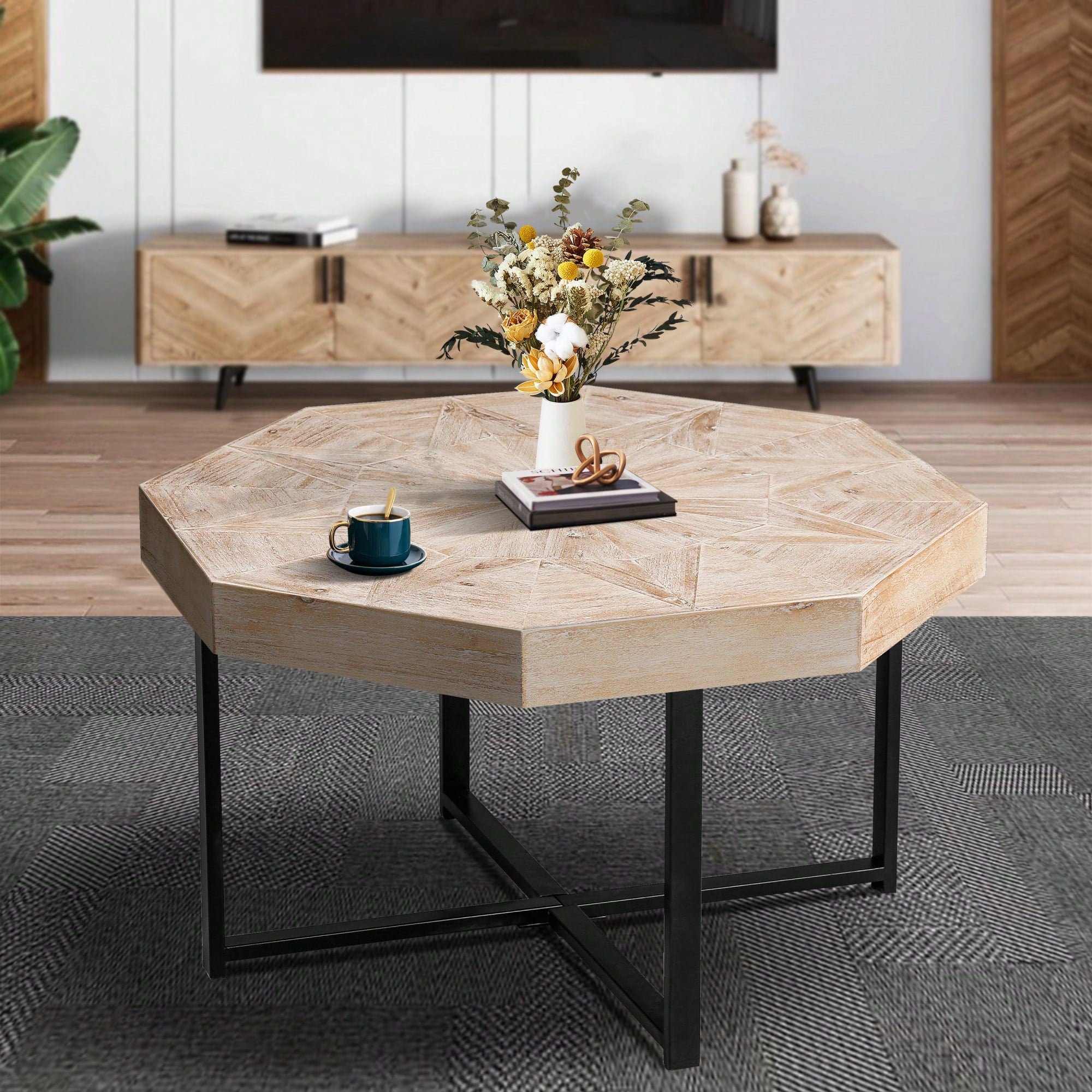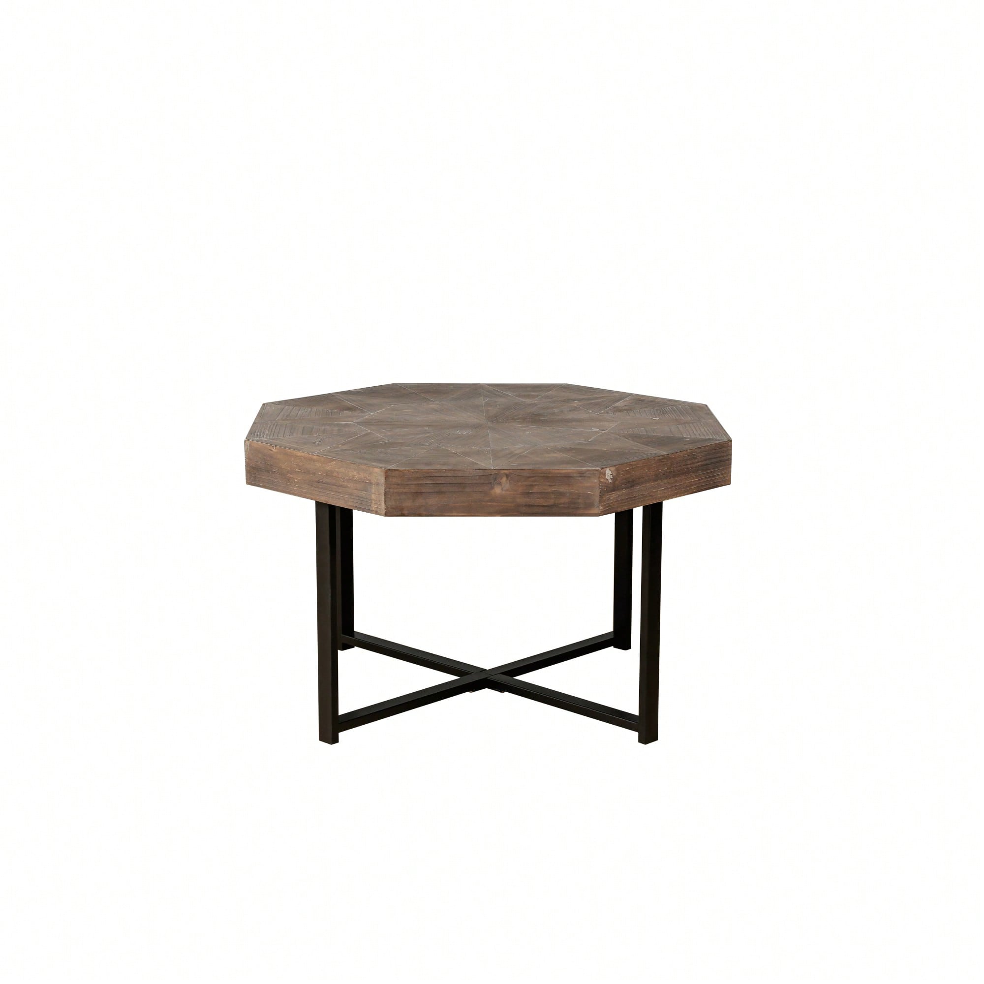 Antique Black Octagonal Wooden Patchwork Coffee Table With Cross Metal Legs For Living Room Decor 30 Inch