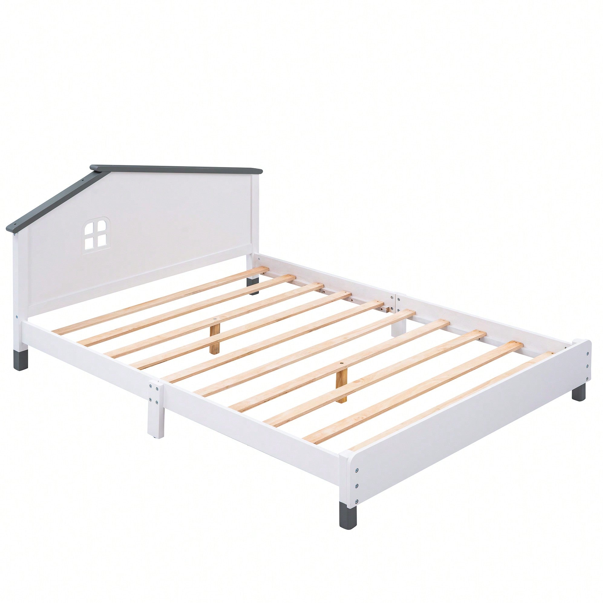 Charming Full Size Wood Platform Bed With Unique House-Shaped Headboard In White And Gray