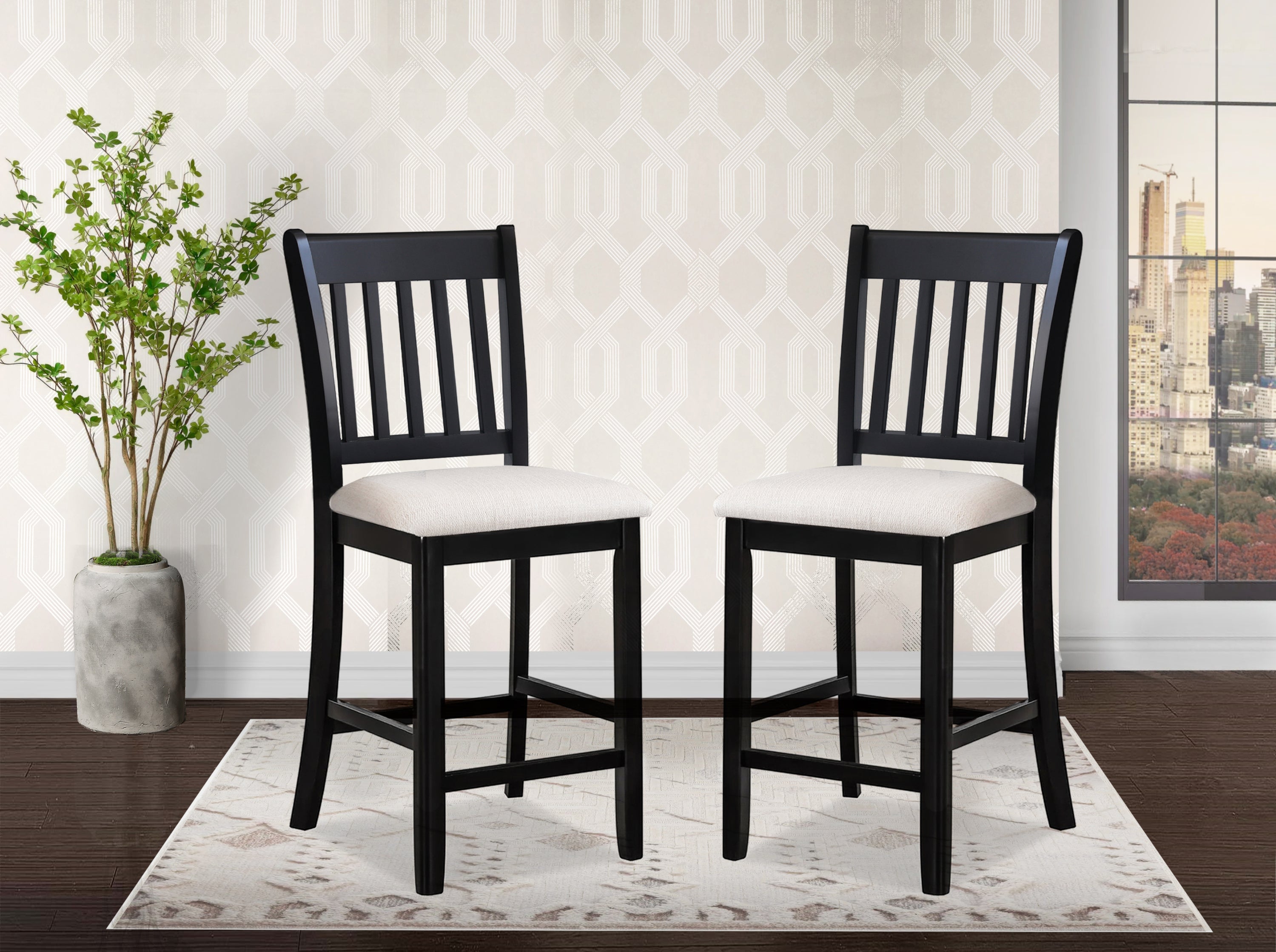 Casual Black Finish Rubberwood Dining Chairs Set of 2 Slatted Back Transitional Counter Seating