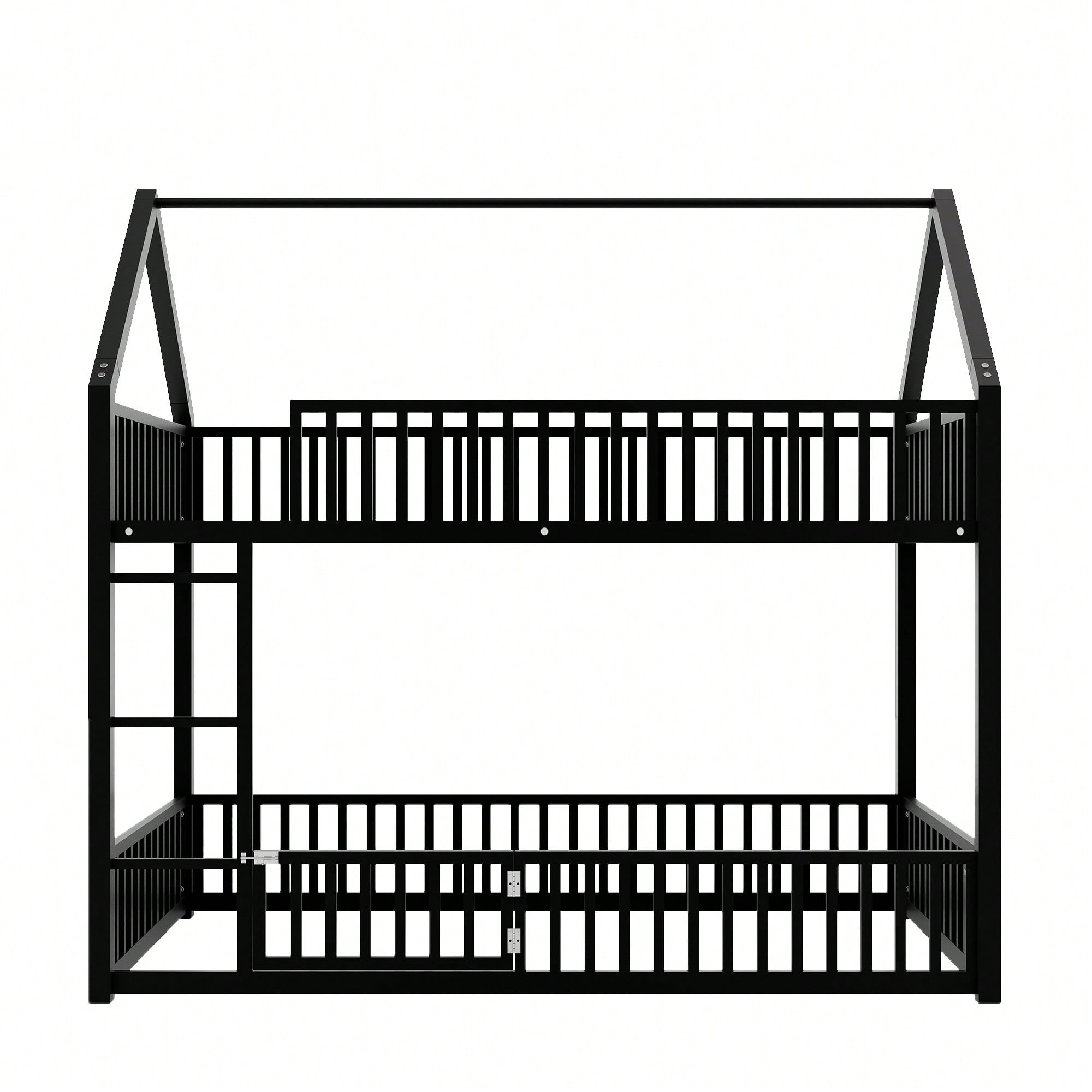 Stylish Metal Twin Over Twin Bunk Bed With Safety Fence And Door In Black Finish