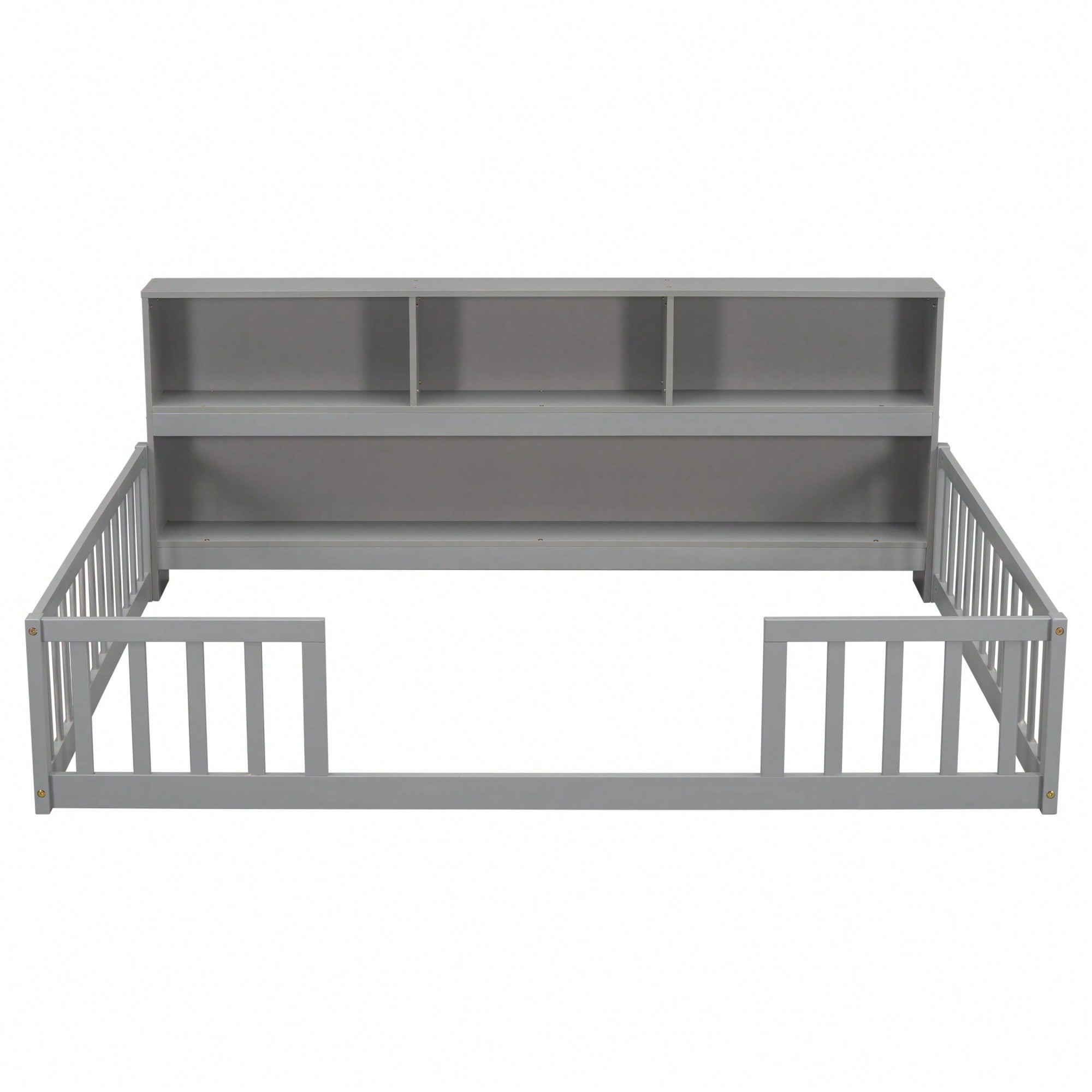 Full Floor Bed With Side Bookcase And Shelves In Grey With Guardrails For Safe Sleeping