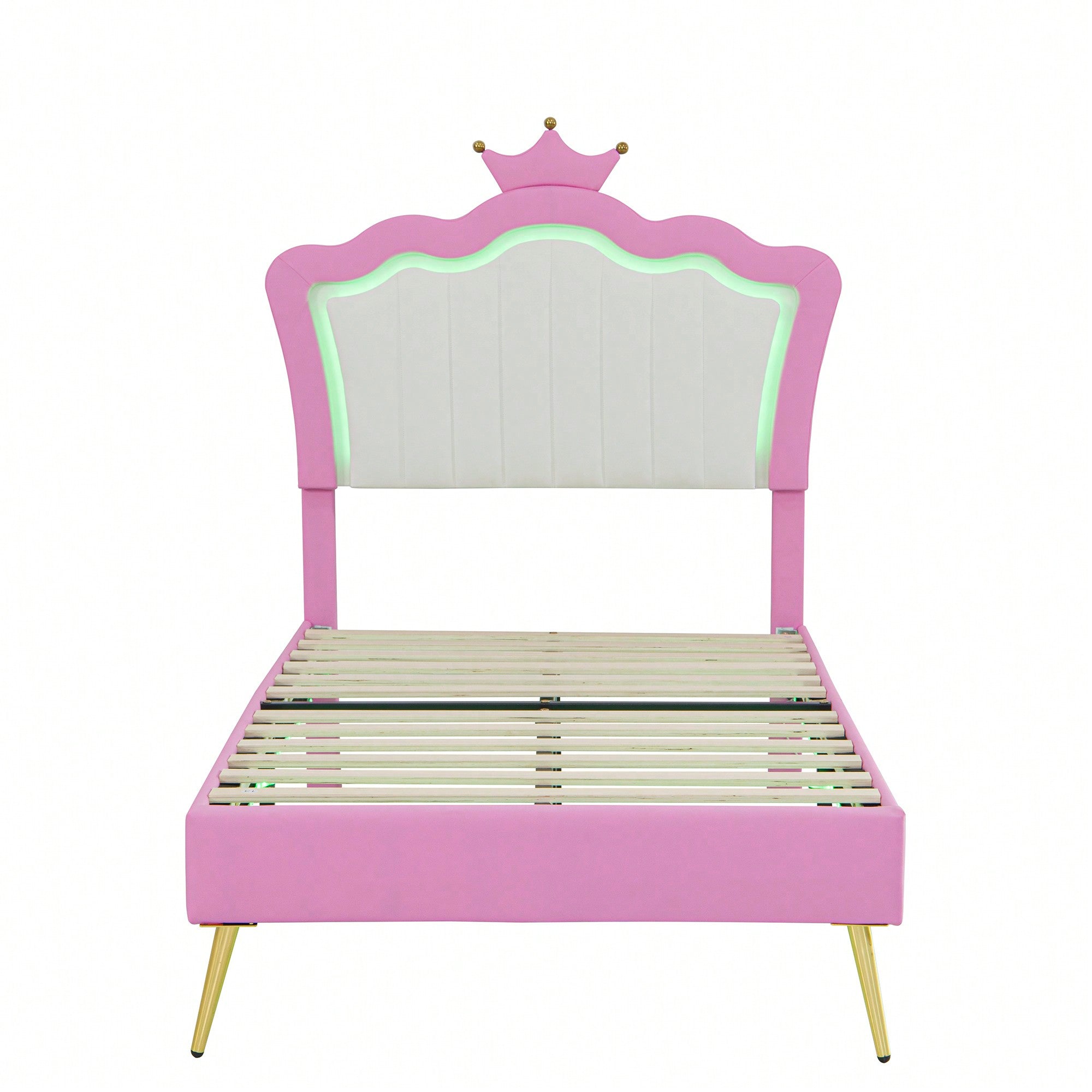 Modern Twin Upholstered Bed Frame With LED Lights And Crown Headboard In Pink And White For A Stylish Princess Bedroom