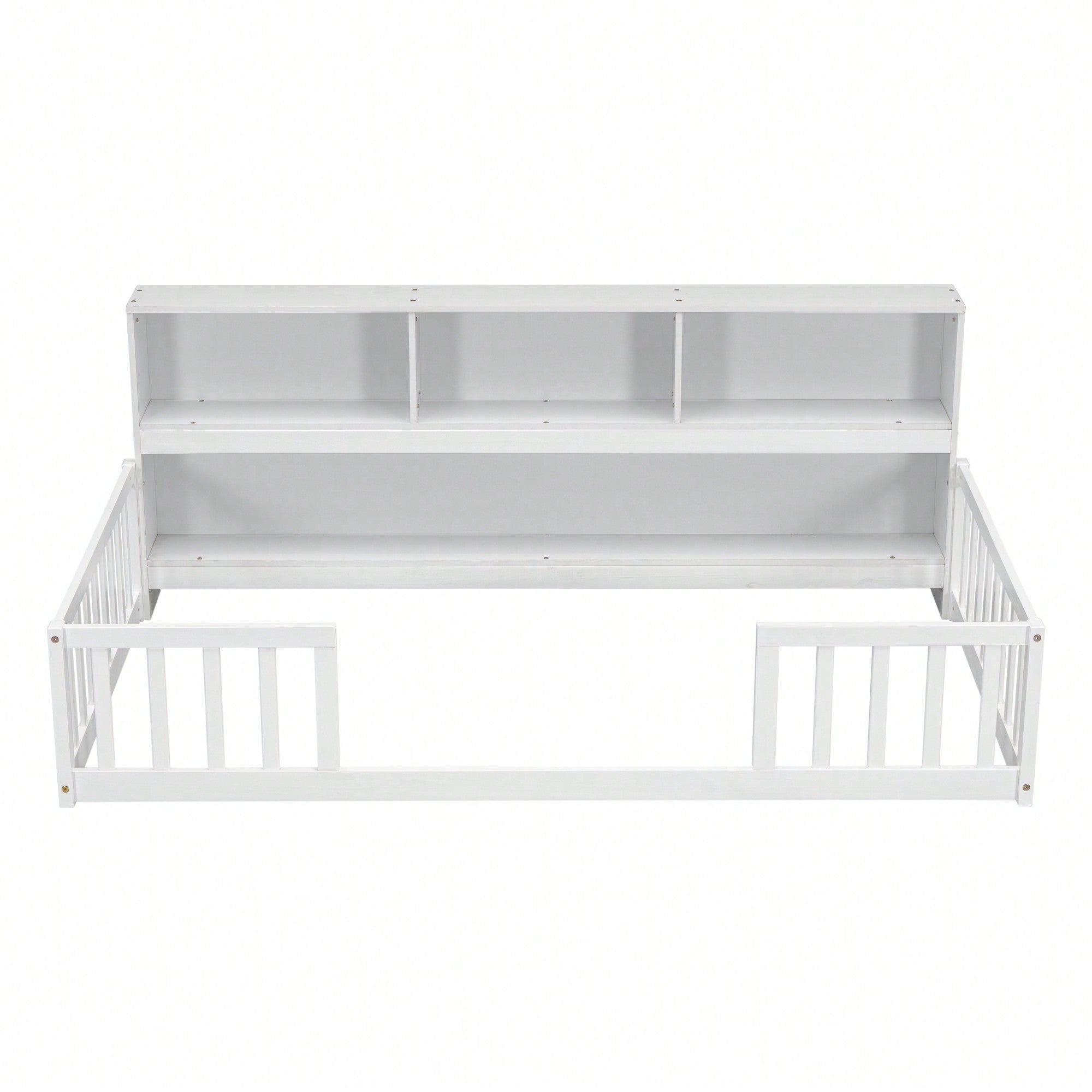 Twin Floor Bed With Integrated Bookcase And Guardrails In White Finish