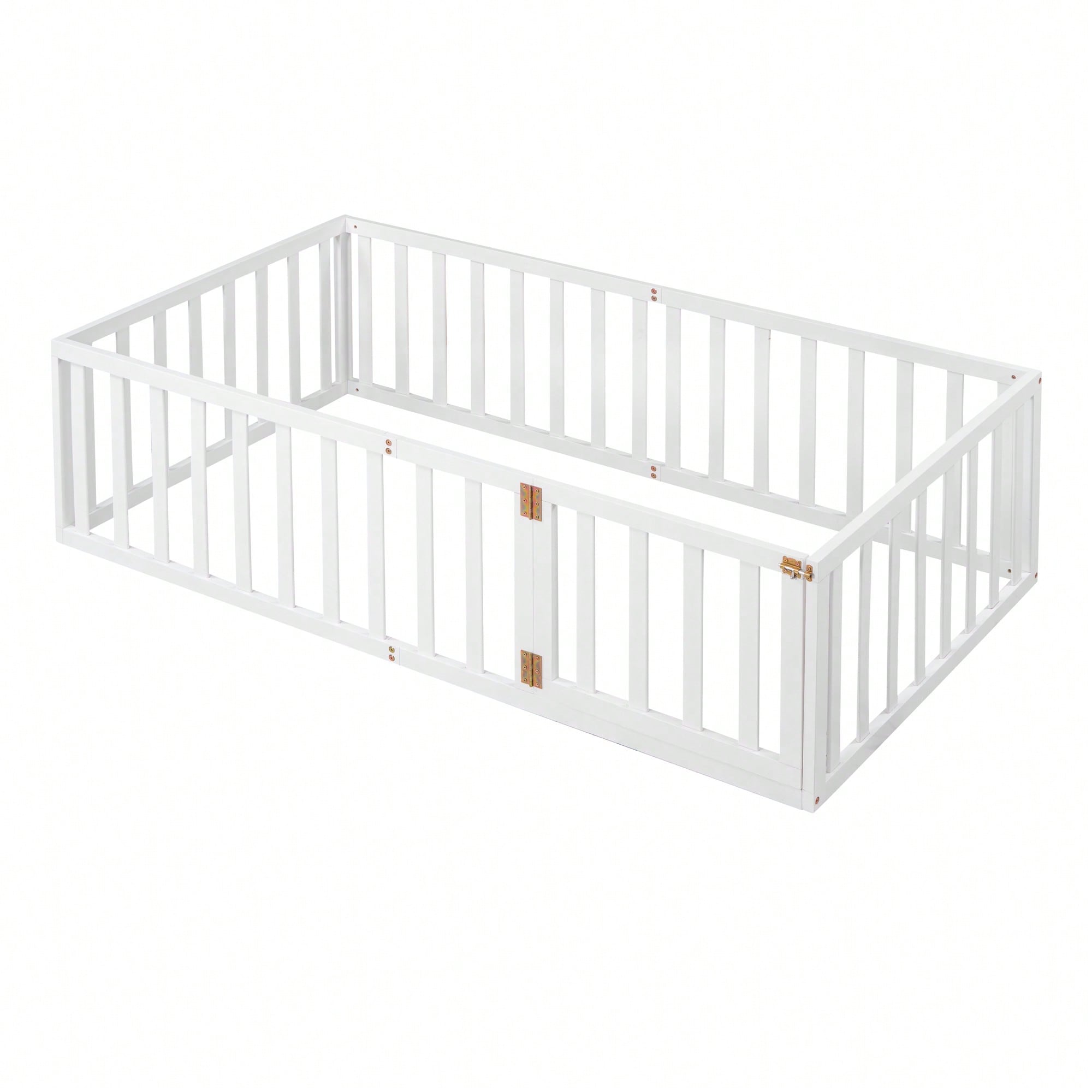 Twin Size Wooden Floor Bed Frame With Safety Fence And Door Natural