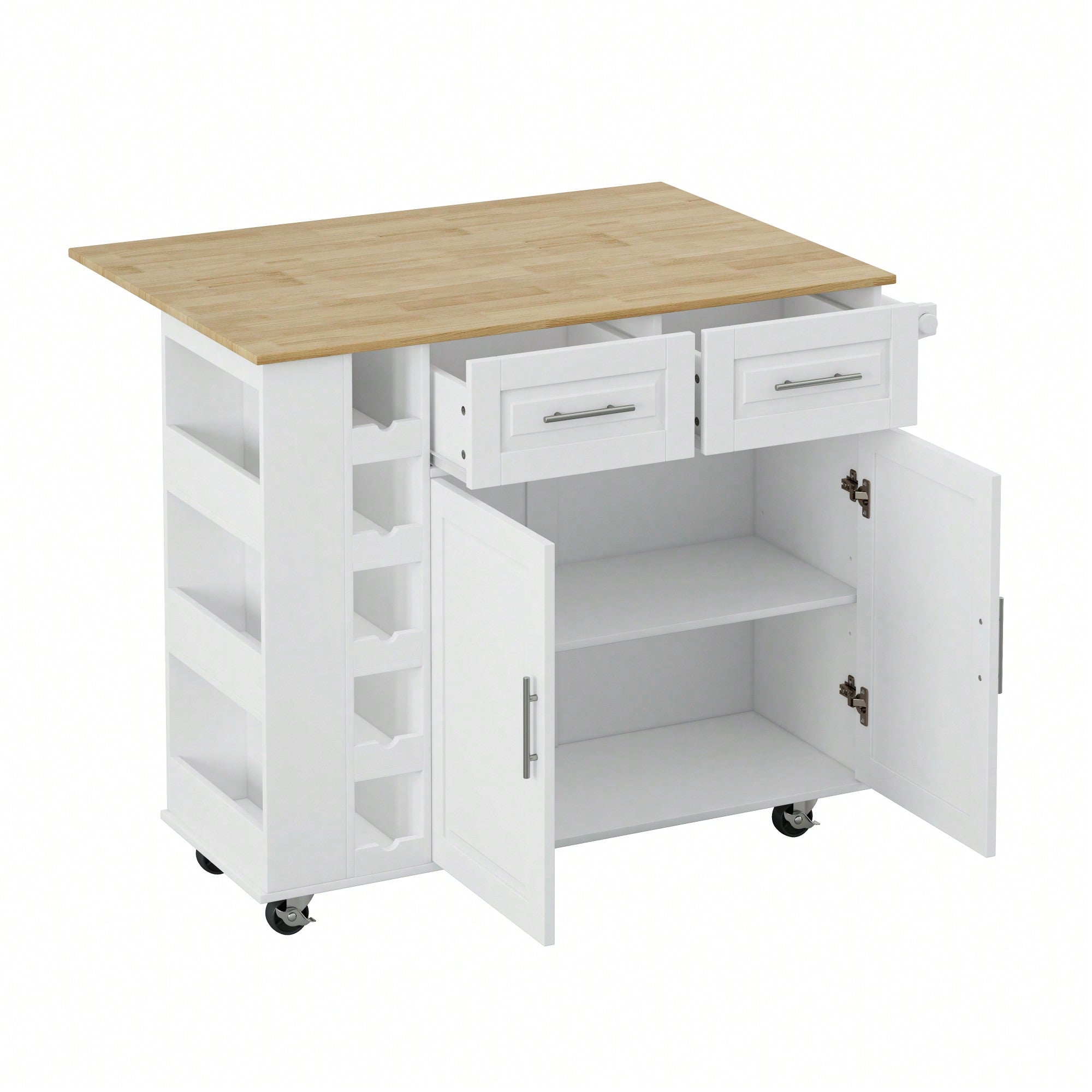 Versatile Kitchen Island Cart with Storage Cabinet Drawers Spice Rack Towel Holder Wine Rack Expandable Rubberwood Top White