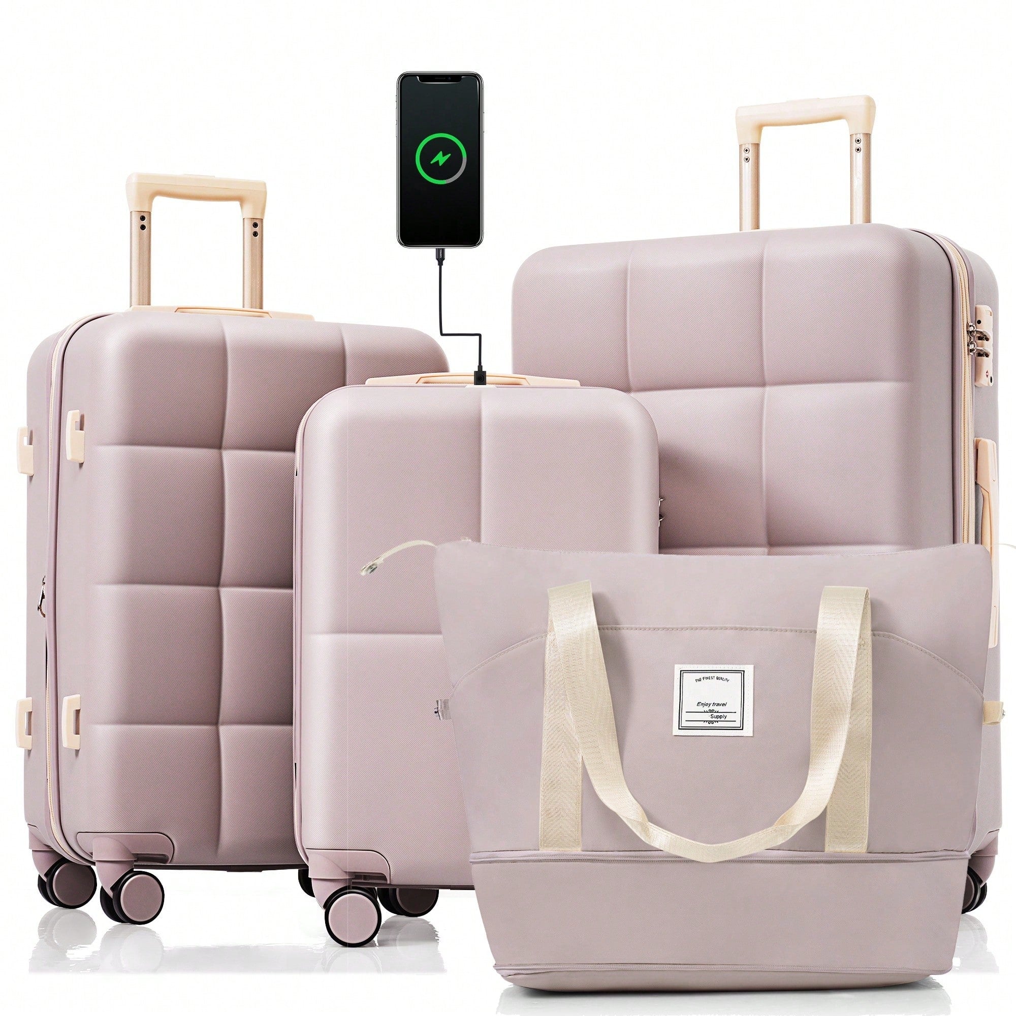 4 Piece Expandable 20-Inch Luggage Set With USB Port Durable Hard Shell Suitcase Travel Bag And Spinner Wheels Light Grey