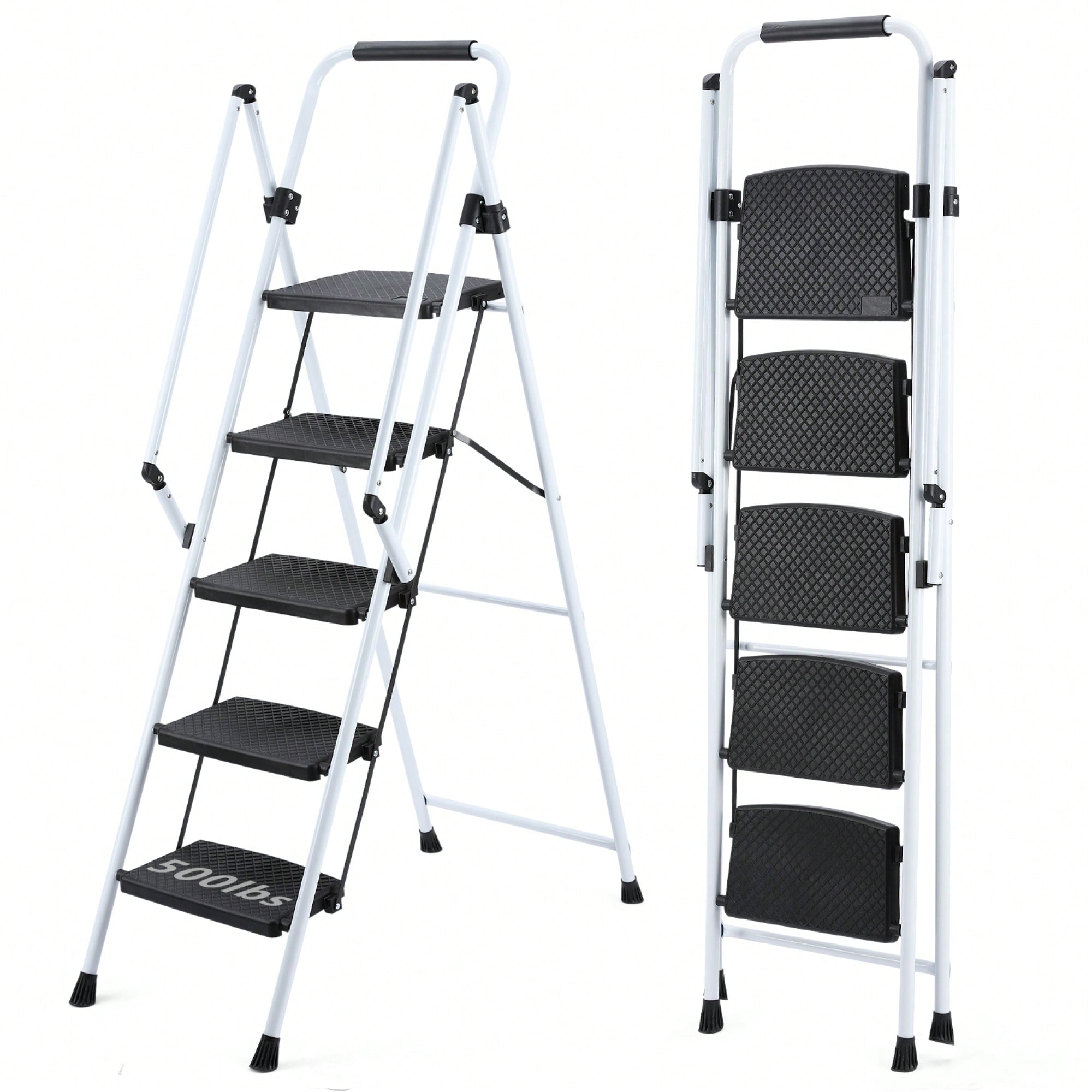5 Step Folding Steel Ladder Stool With Anti-Slip Wide Pedals And Safety Handle Lightweight 300 Pound Capacity White