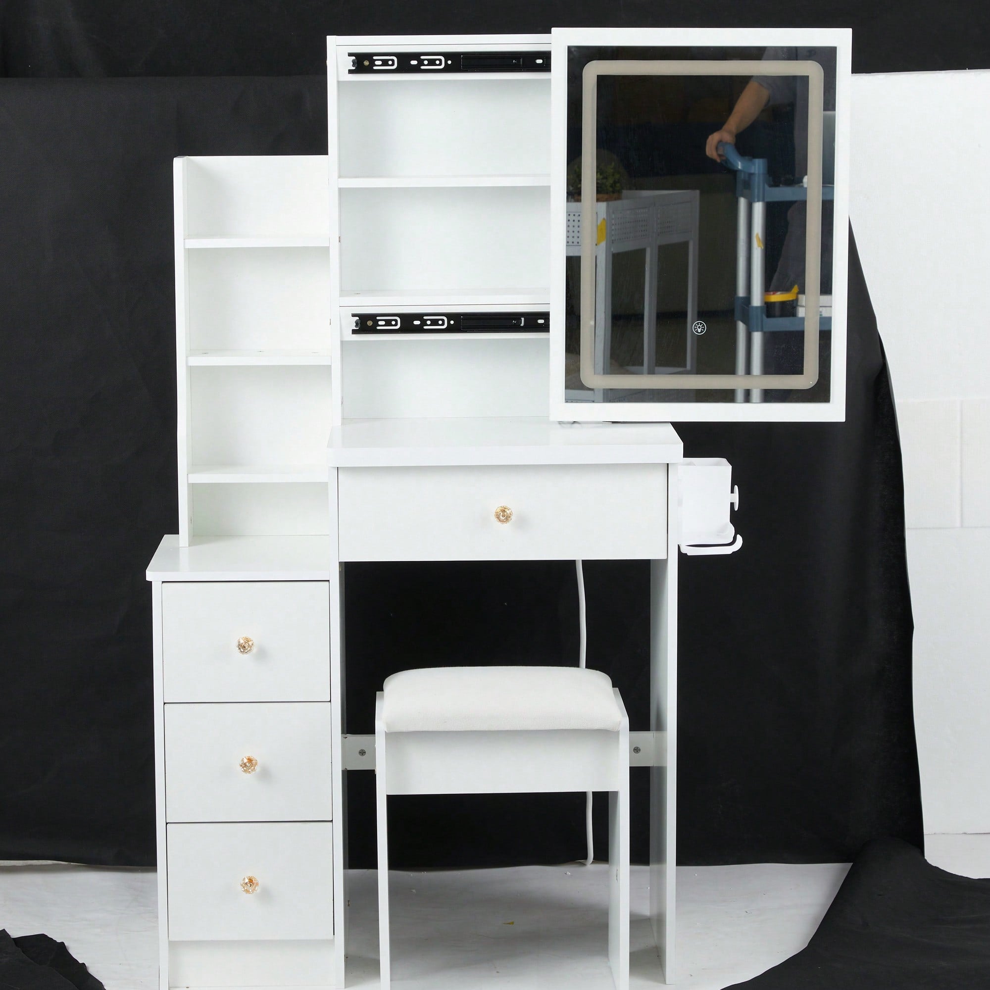 Compact Vanity Table with Cushioned Stool 2 AC Outlets 2 USB Ports Hair Dryer Holder Large Touch Control LED Mirror Tri-Color Options Safe