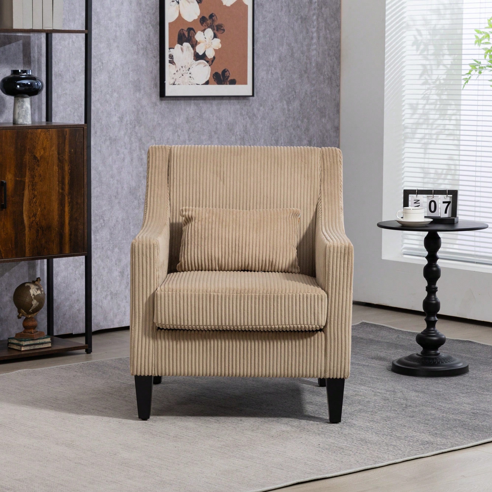 Regular price $258.99 USDSale price $258.99 USD Regular priceUnit price per$389.99 USDSale Sold out- Modern accent chair with scooped arms - Upholstered in soft beige corduroy fabric - High resilience foam cushions for comfort - Sturdy metal and wooden...