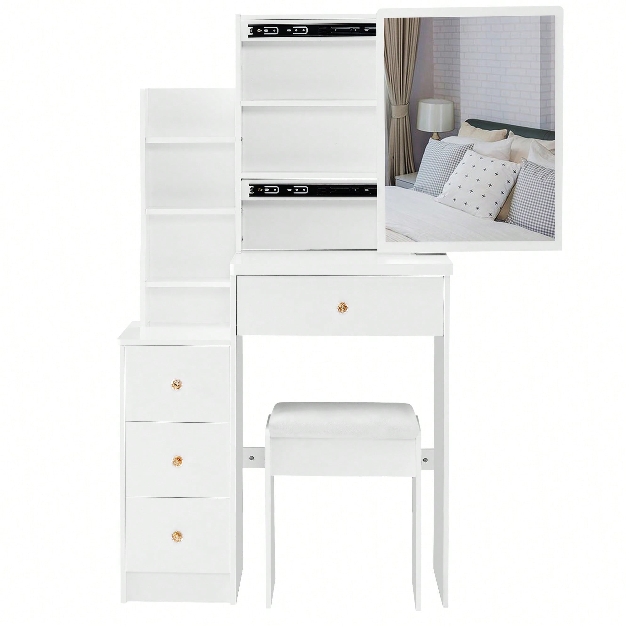 Compact Vanity Table with Cushioned Stool and Large Sliding Mirror Stylish Multi-Layer Dresser for High Capacity Storage Safe Certified