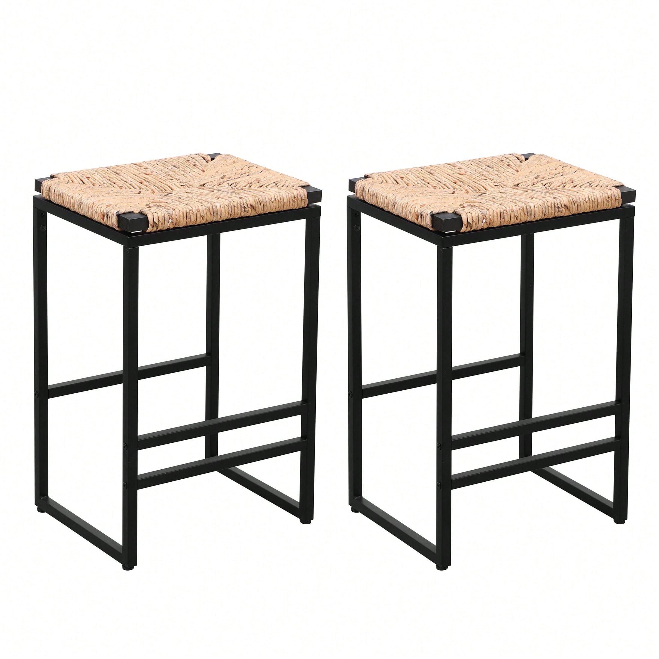 Set Of 2, Water Hyacinth Woven Bar Stools For Kitchen Counter Water Hyacinth Grass Backless Barstools With Footrest