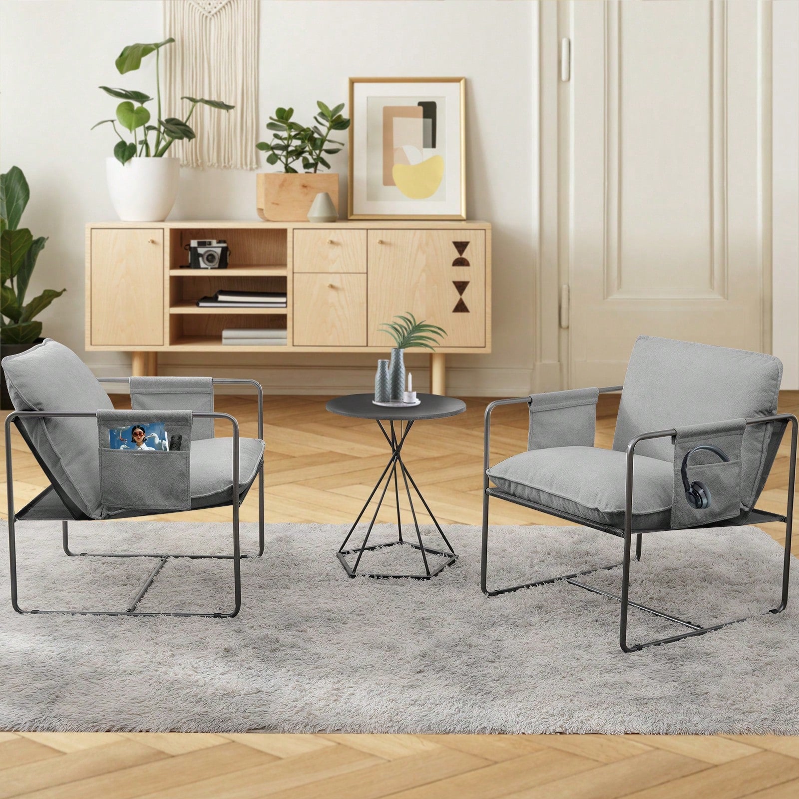 2 Piece Grey Upholstered Hanging Chair Set with Arm Pockets and Crushed Foam Cushions for Living Room Bedroom or Balcony