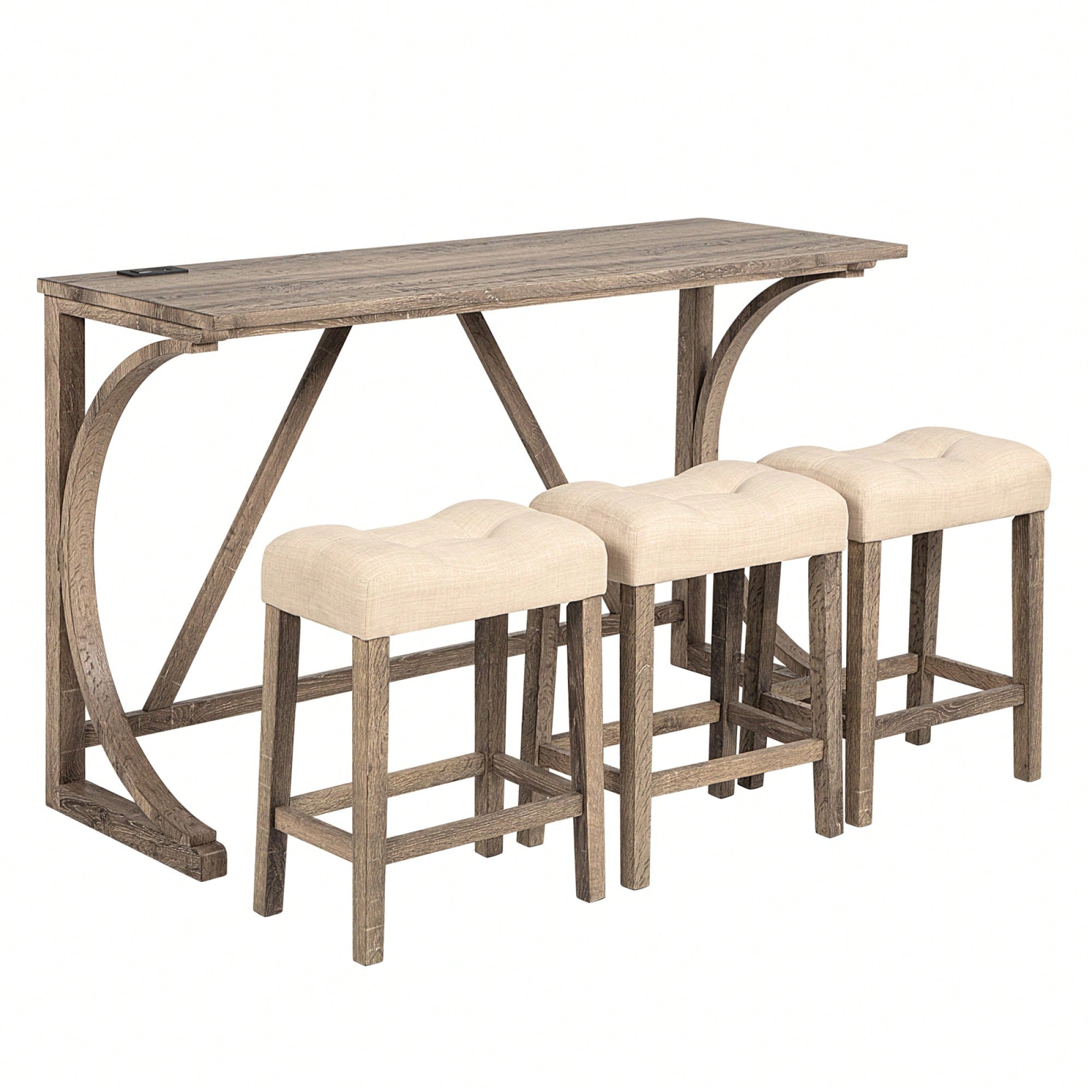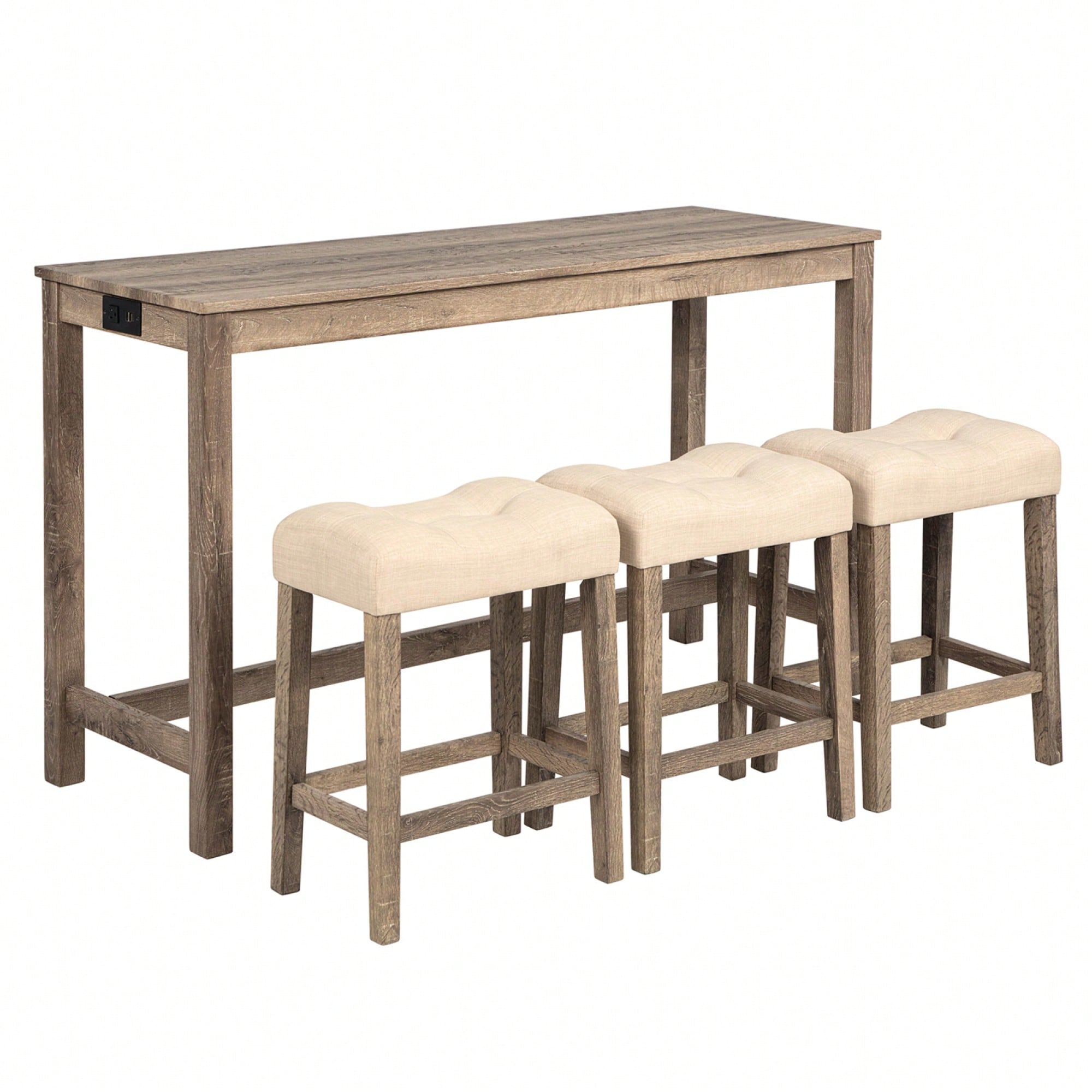 4-Piece Brown Bar Table Set With Power Outlet And 3 Padded Stools For Dining Room, Living Room And Game Room