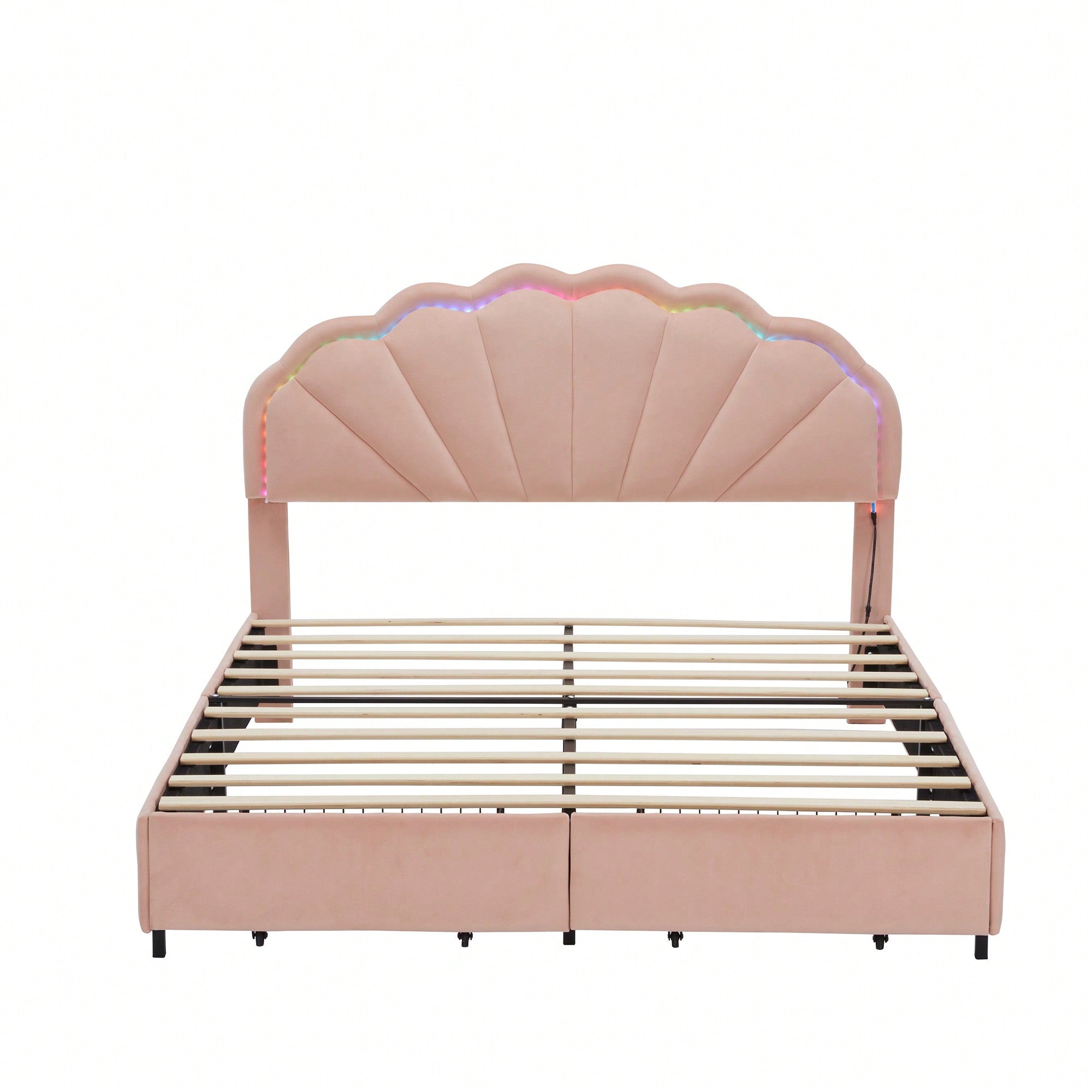 Full Size Upholstered Pink LED Bed Frame With Storage Drawers And Stylish Petal Headboard For Girls