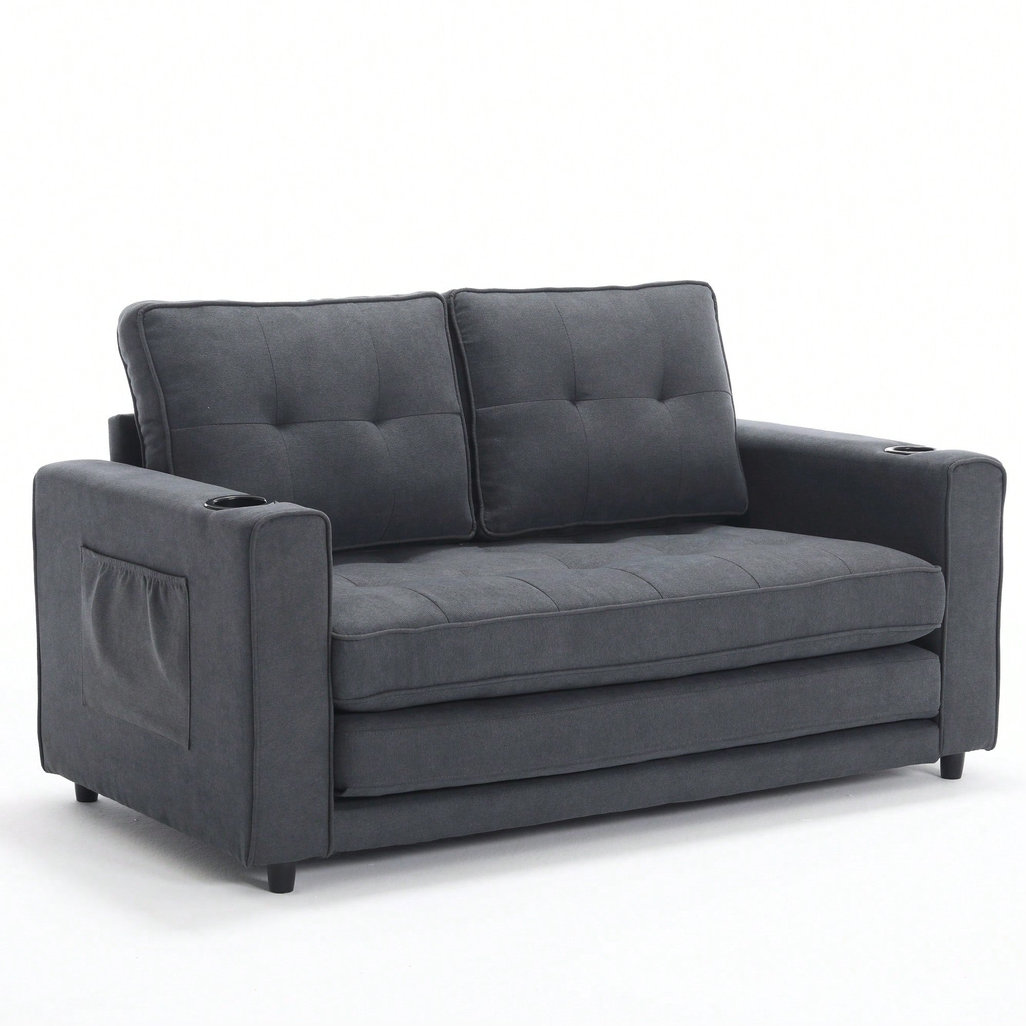 3-In-1 Convertible Upholstered Futon Sofa Bed With Pull Out Sleeper And Side Pockets, Dark Gray Loveseat Daybed With Cup Holder