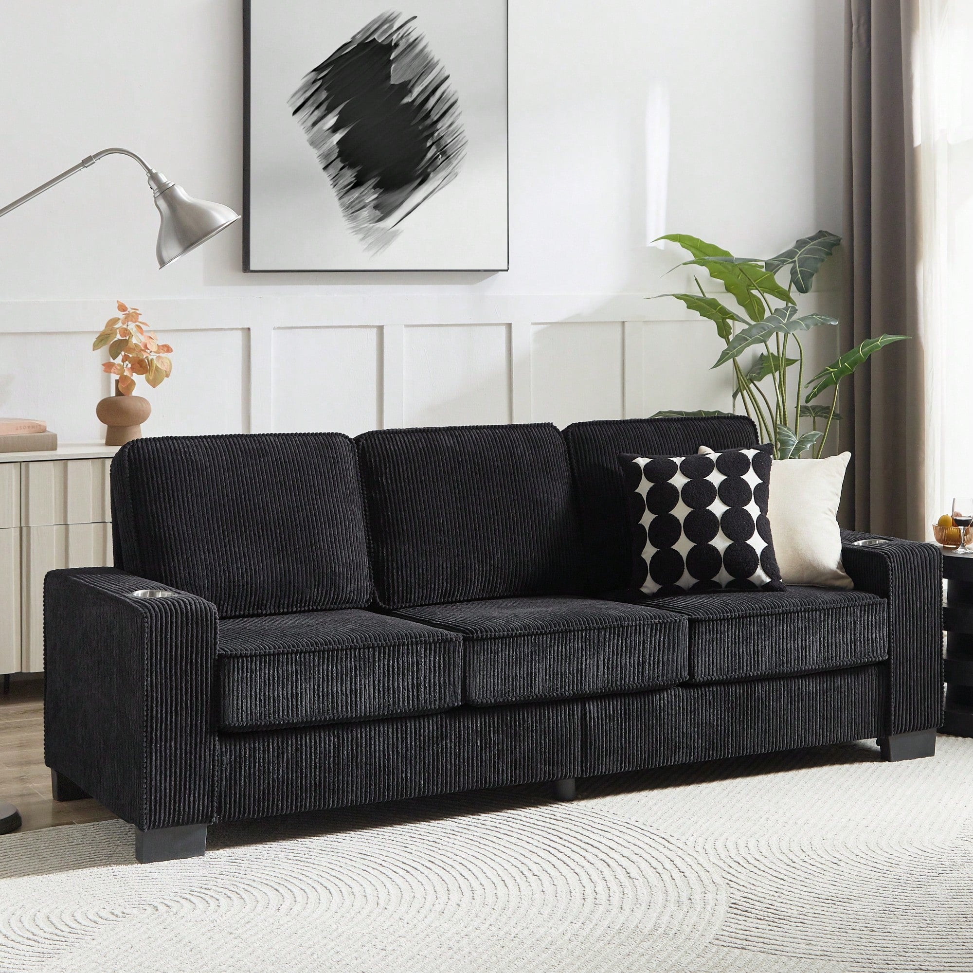 Modern 3-Seater Corduroy Sofa For Living Room Bedroom Office In Black Compressed Design