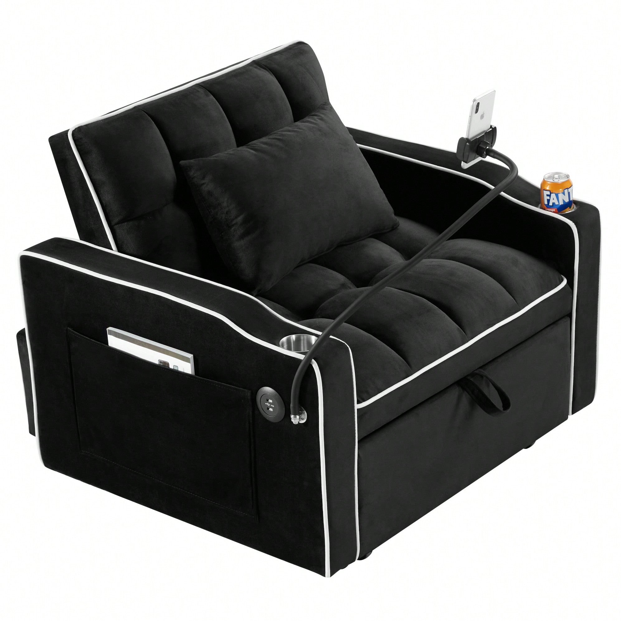 Adjustable Convertible Sleeper Chair Sofa Bed With Multi-Pockets For Small Spaces In Black