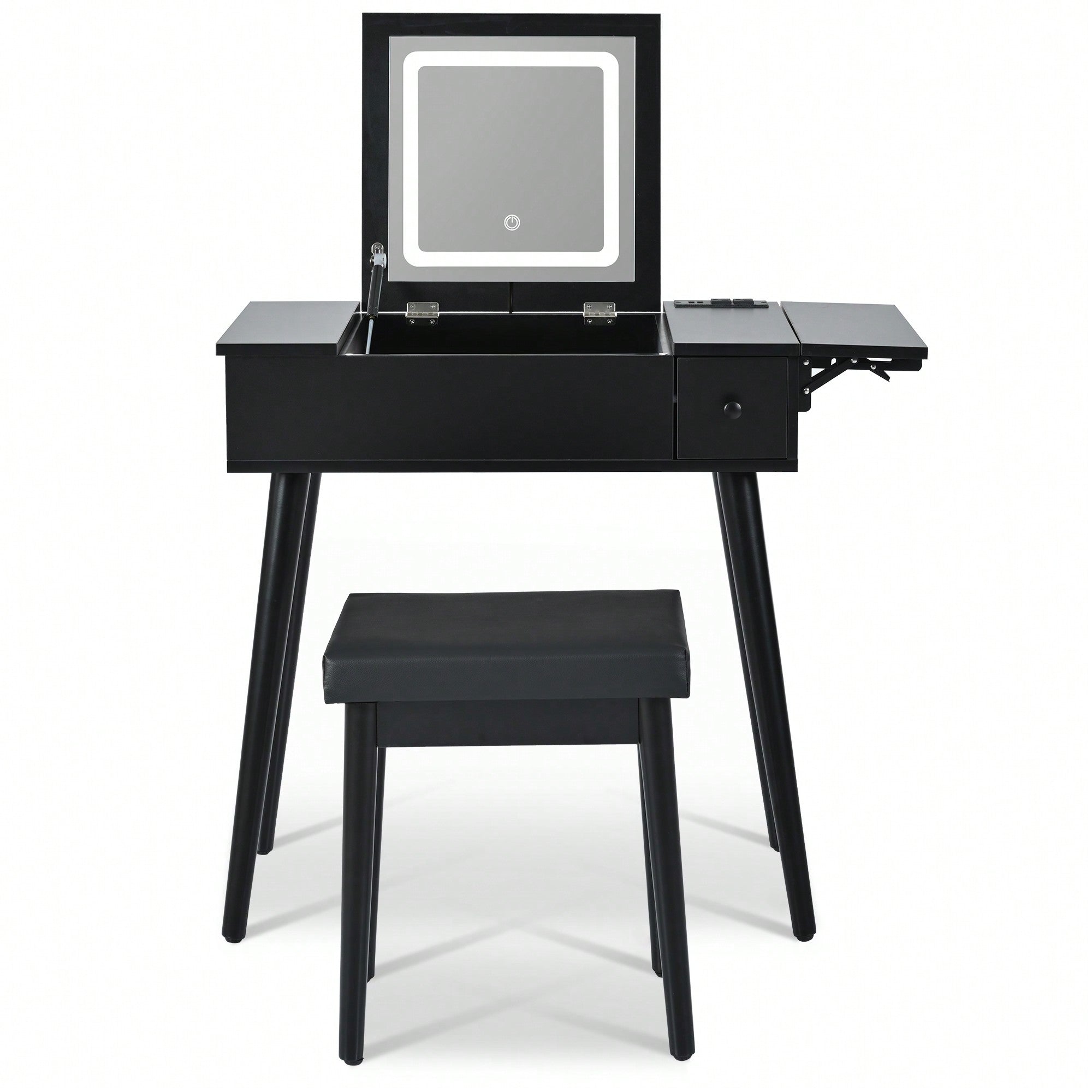 27.9 Inch Black Makeup Vanity Desk With LED Mirror And Charging Station, Dressing Table With 2 Drawers And Foldable Panel, Complete Vanity Set With Cushioned Stool For Bedroom