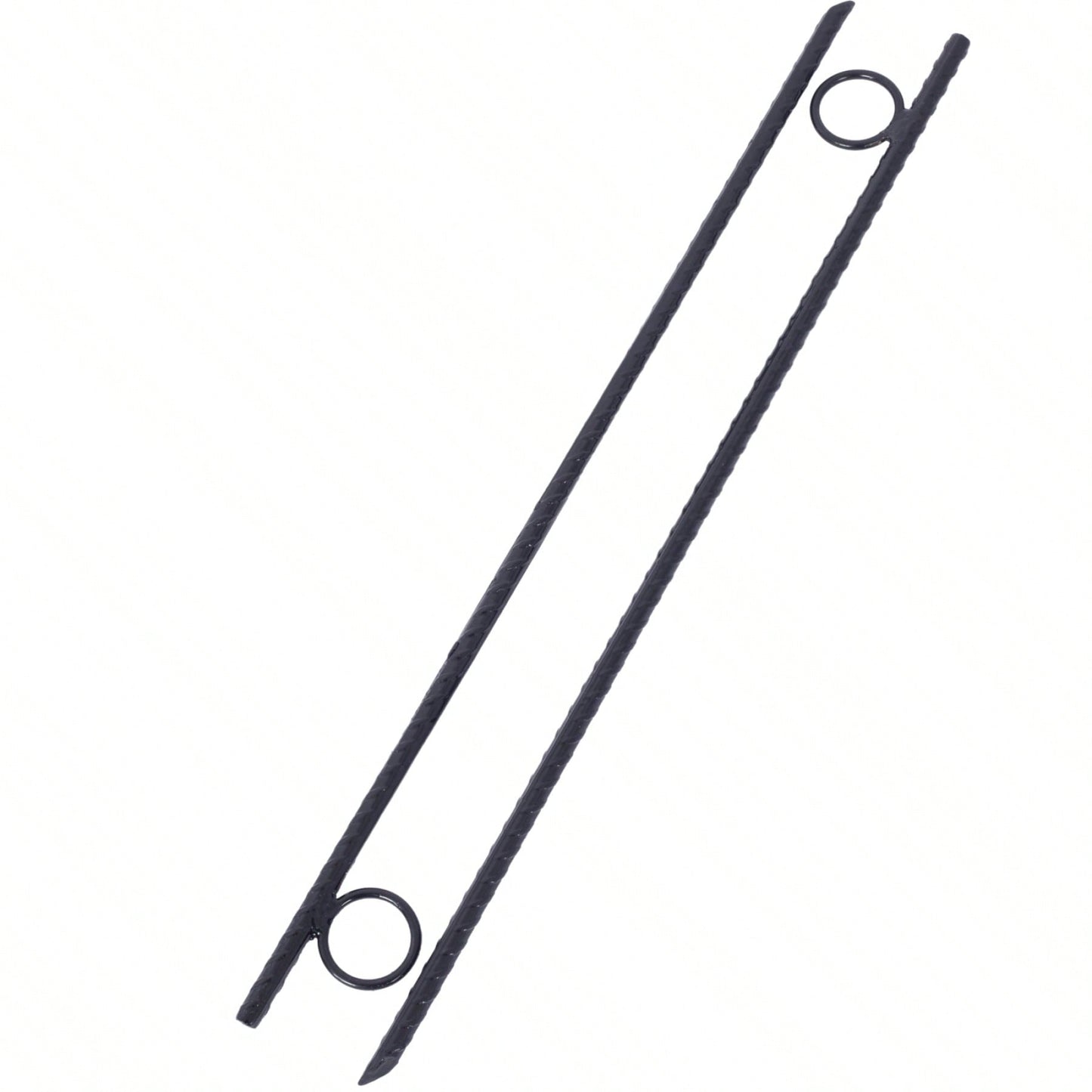 Durable and heavy-duty rebar stakes designed for outdoor use. Made from robust 3/8" steel, these stakes measure 18" in length and provide reliable stability for various applications. The ribbed exterior ensures superior grip, preventing slipping even in challenging conditions. Each stake features a sharp, angled end for easy installation into the ground. With a convenient 1" loop, these stakes are perfect for securing tents, canopies, tarps, and more.