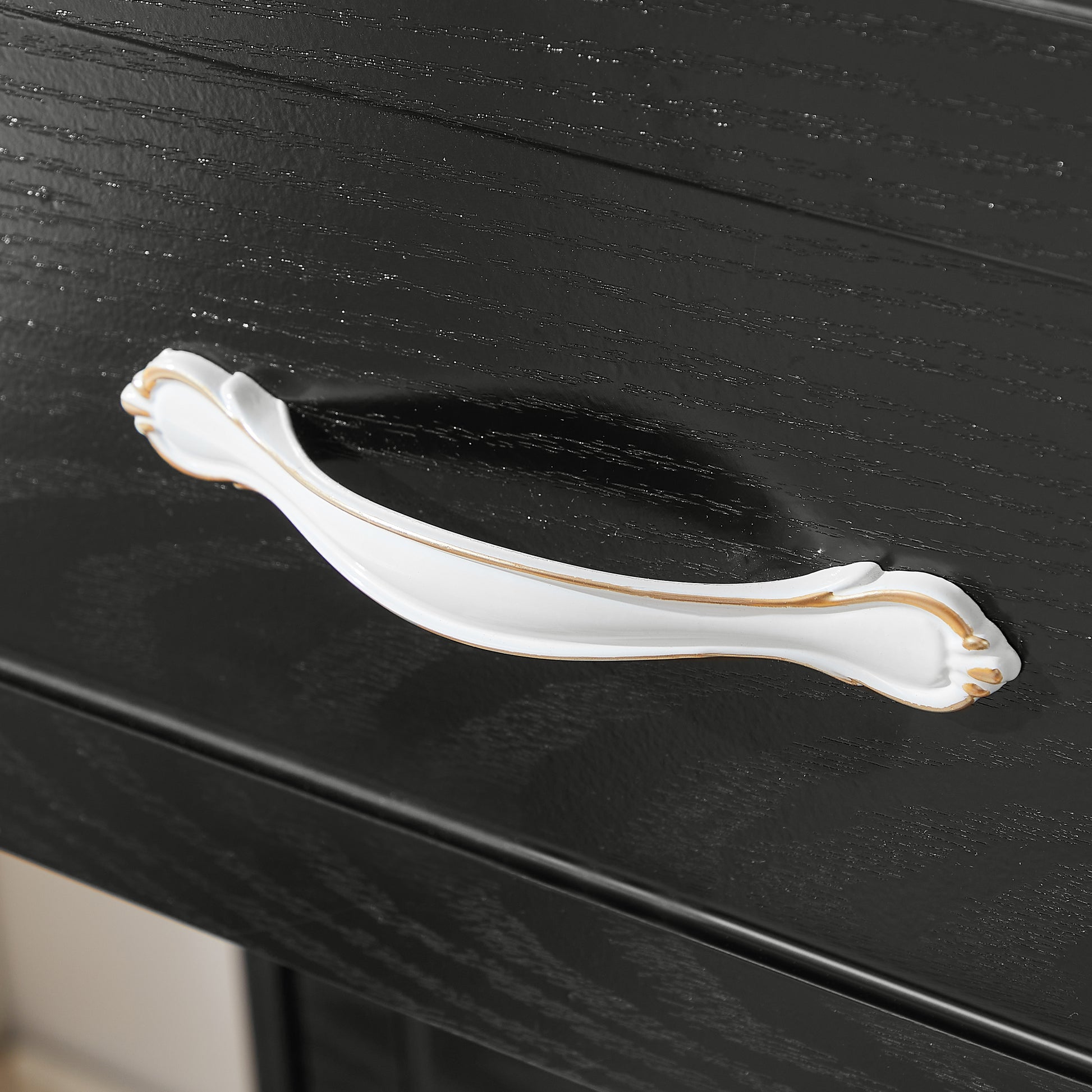 • Each drawer is equipped with smooth metal rails on both sides for easy pull-outs and antique style white aluminum pulls with gold trim; equipped with an anti-tip device that can be mounted on the back of the cabinet and on the wall to improve the safety of the cabinet.