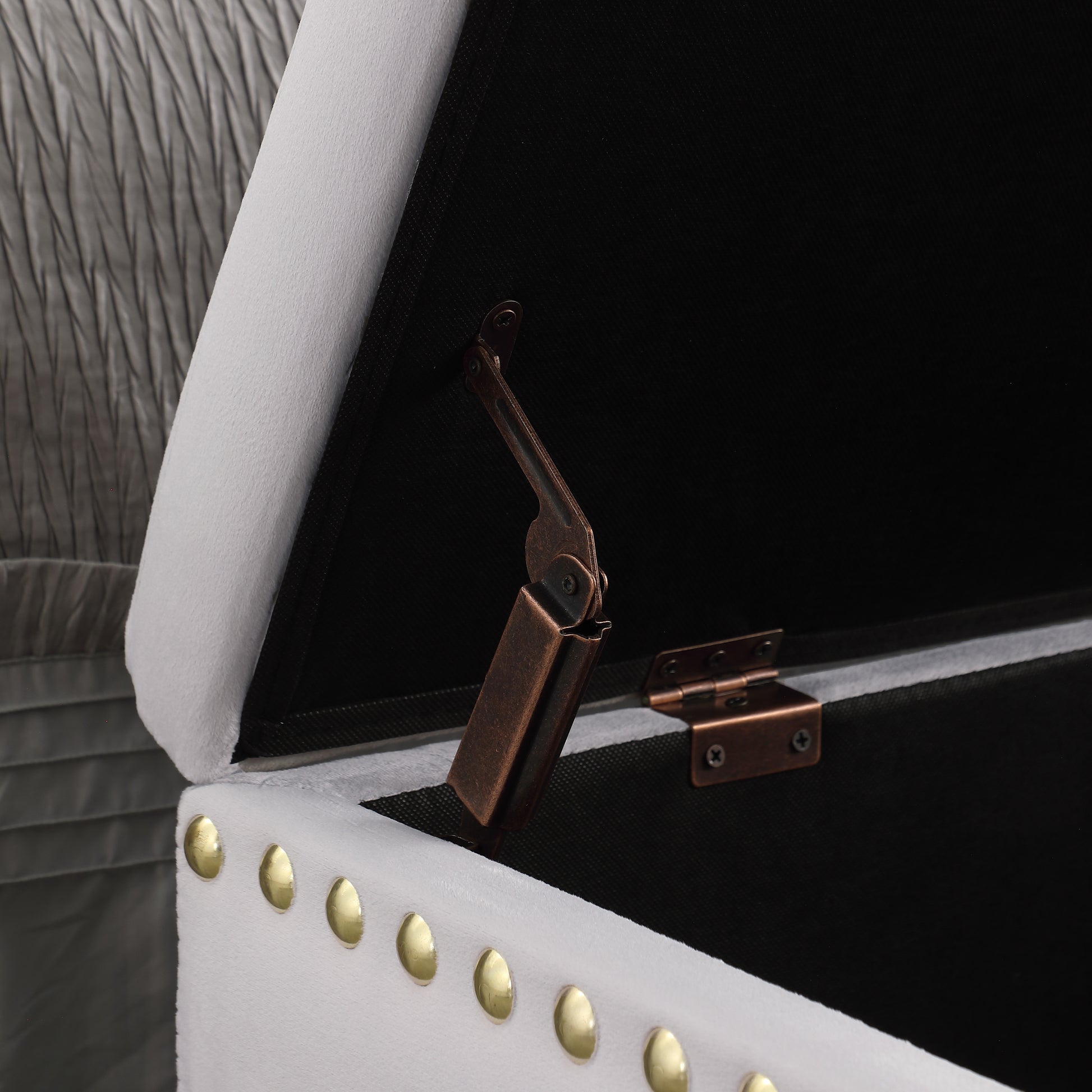This unique large storage bench features ample storage space, perfectly complemented by a smaller bench nestled inside. Both benches are adorned with a plush velvet finish and elegant nailhead trim, adding a touch of sophistication to any room. This versatile dual storage bench fits anywhere in your home, making it perfect for the entryway to sit and store shoes, in the living room to hide clutter, or at the end of your bed for extra storage. The smaller bench can be used for additional seating or as a footrest and is easy to put away when not in use. The design maximizes storage space without taking up extra room, making it ideal for small apartments or compact spaces. The luxurious velvet finish and nailhead trim enhance your decor, while the shiny metal feet ensure durability and stability.