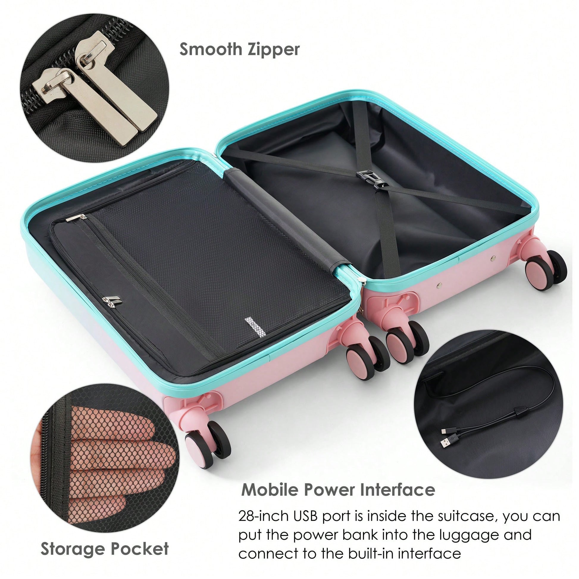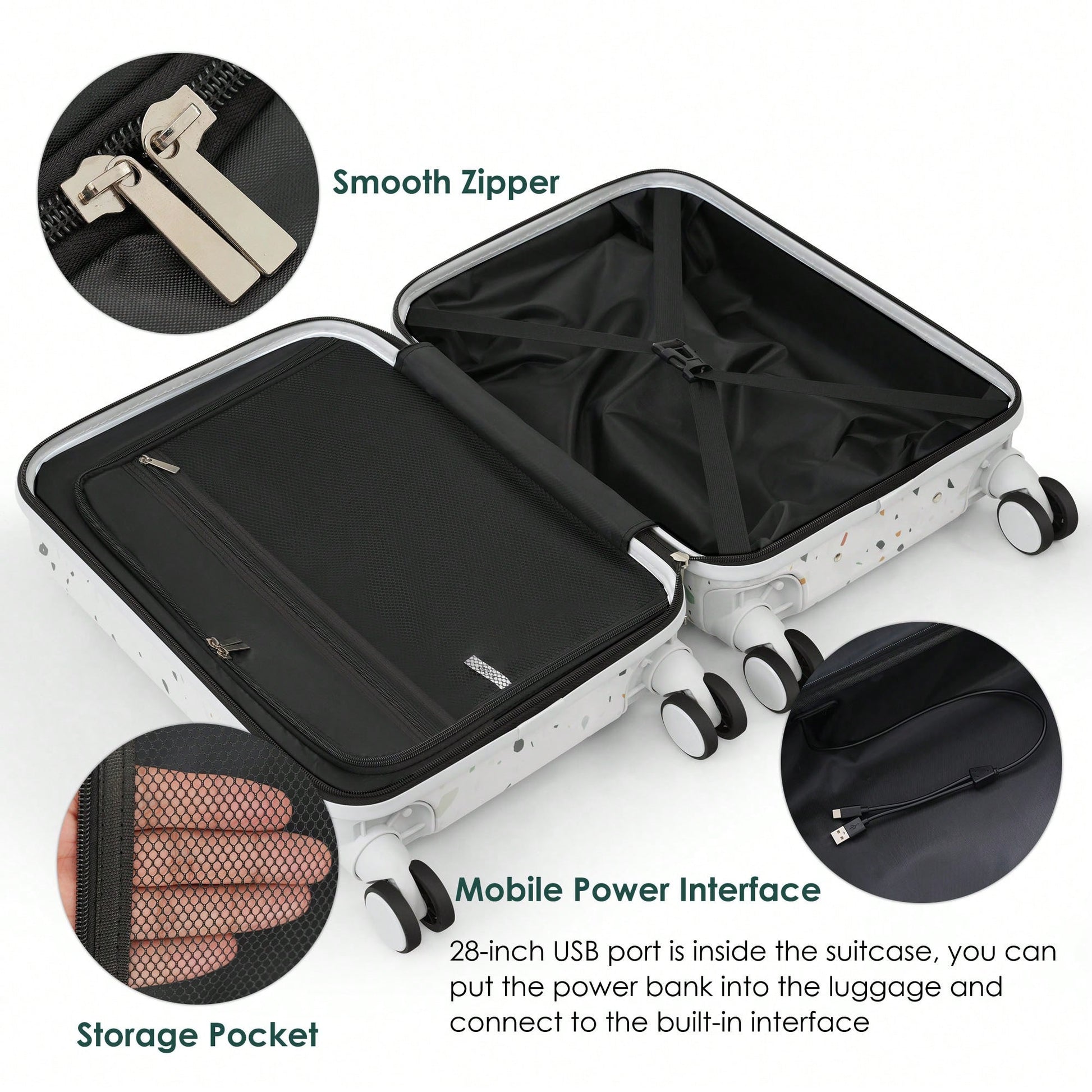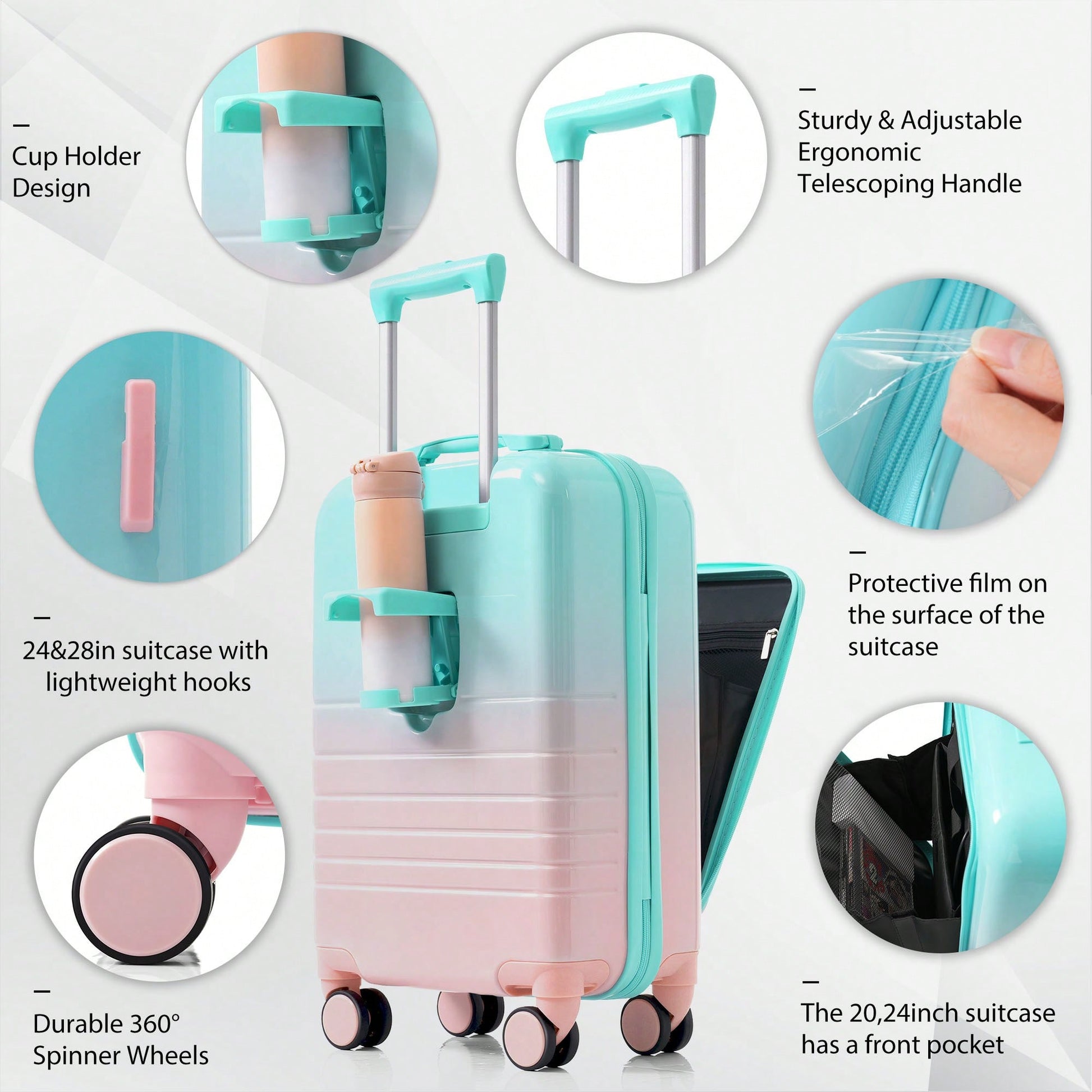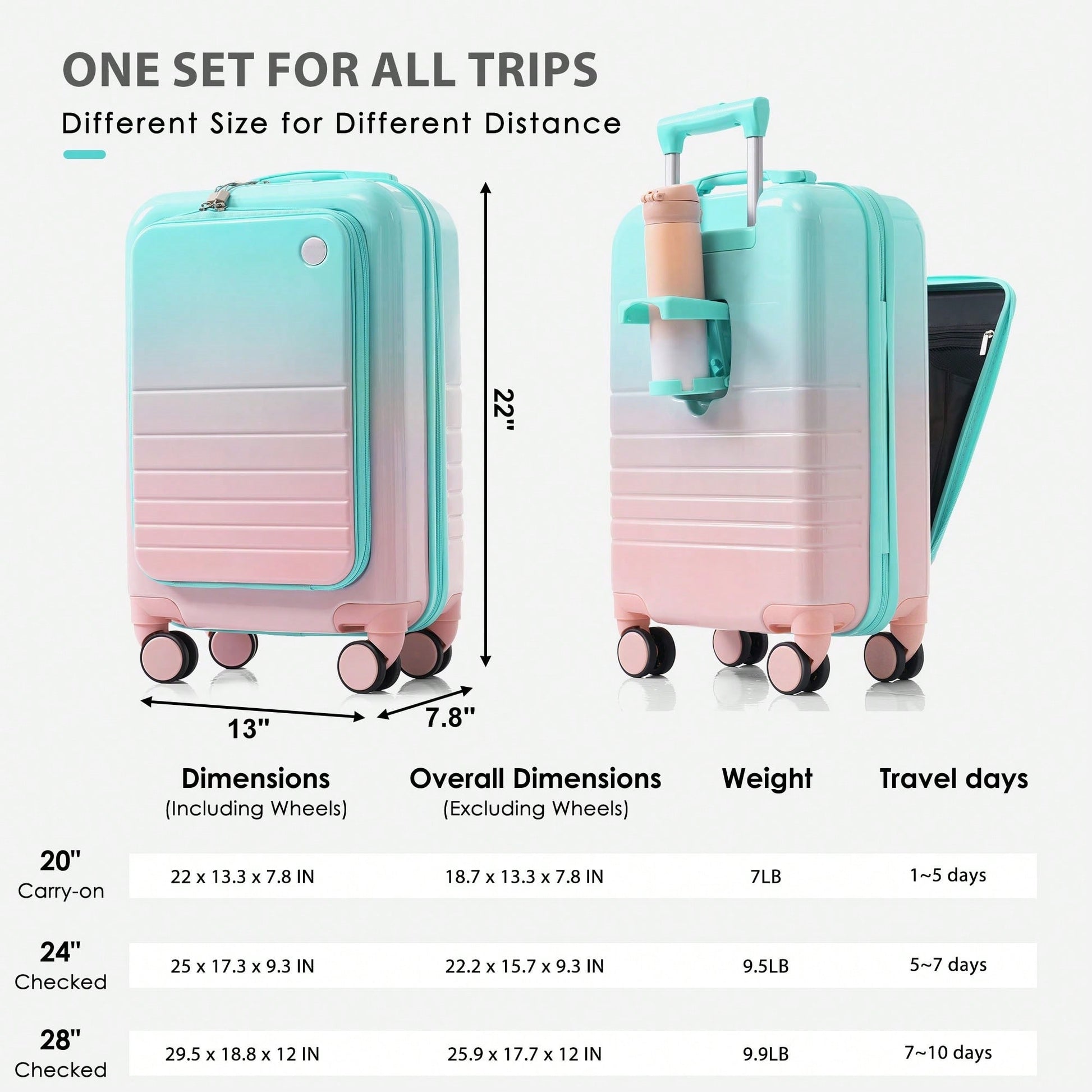 This luggage set is designed to make travel hassle-free and enjoyable. The 20, 24, and 28-inch cases are perfect for various travel needs, with the front opening design on the smaller sizes allowing for quick packing and unpacking. Each suitcase is equipped with 360-degree rotating wheels, enabling smooth navigation through busy airports and streets. Stay connected during your travels with built-in USB ports to charge your devices conveniently. Thoughtful organization features, such as a bag hook and cup holder, enhance your travel experience. Made from durable ABS+PC material, this luggage set ensures that your belongings are well-protected and arrive safely at your destination.
